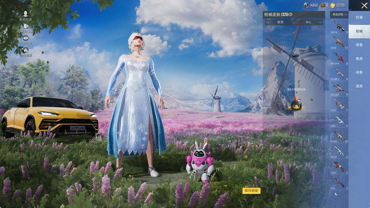 AKM-甜心宝贝,SCAR-L-梦幻火箭,M416-五爪金龙,GROZA-镜光银凌,AUG-超新星,M762-鬼刀,Kar98K-绿意幻情,Kar98K-巳巳如意,AWM-花间之火,MG3-洛神天依