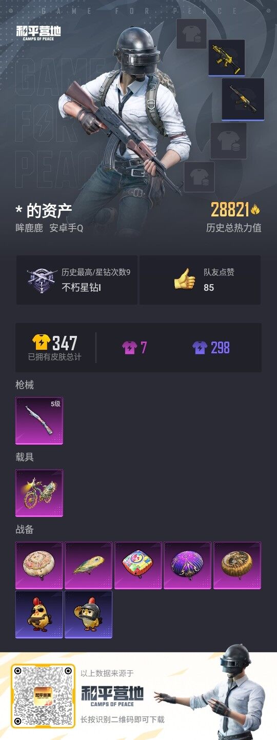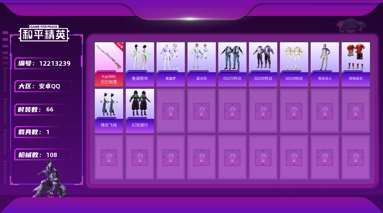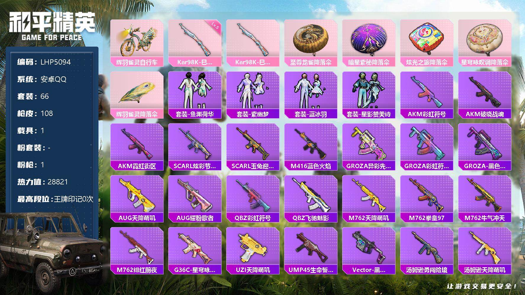 - [12339790]【特价急出/详情看图】:安卓 手Q-2粉装-2特效枪-1载具-3粉色飞行器-4.7w热力值-9王牌印记-142套装-156枪皮【热门品类】:套装-奇异狩猎者,套装-金羽特工,套装-龟仙人,套装-粉红小猪【粉色载具】:鬼马风驰【粉色套装】:粉装-橘柚倾心,粉装-幻影飞狐【粉色枪皮等级】:Kar98K-巳巳如意(五级),DP-28-豹影疾电(五级)【粉色飞行器】:庄周梦蝶飞行器,闪光银龙飞行器,太空嘟嘟飞行器