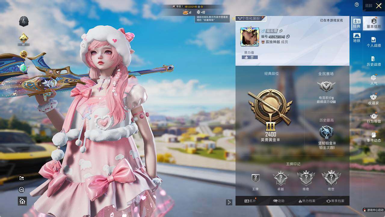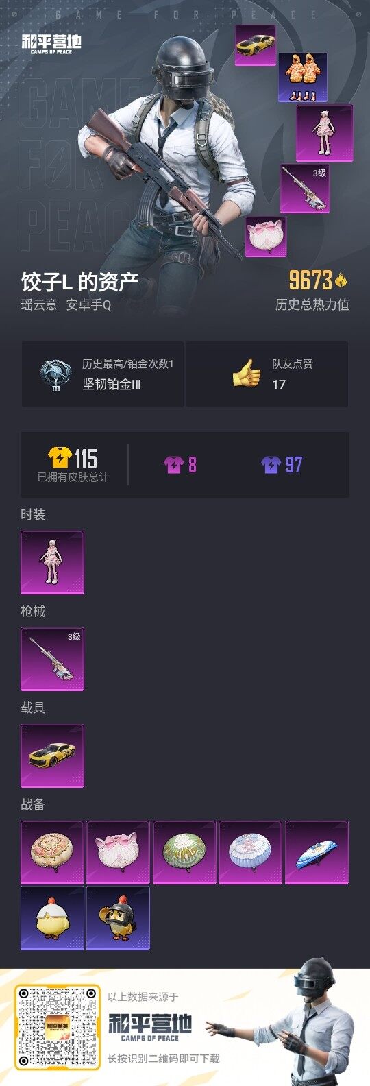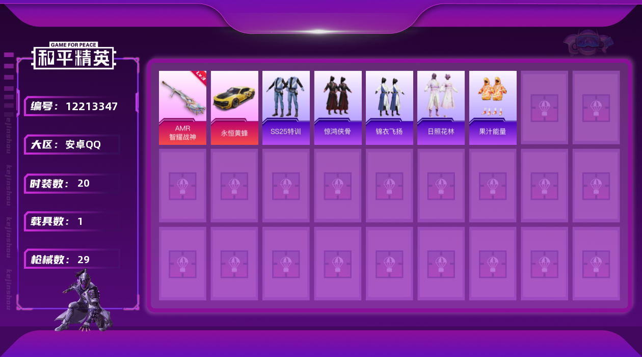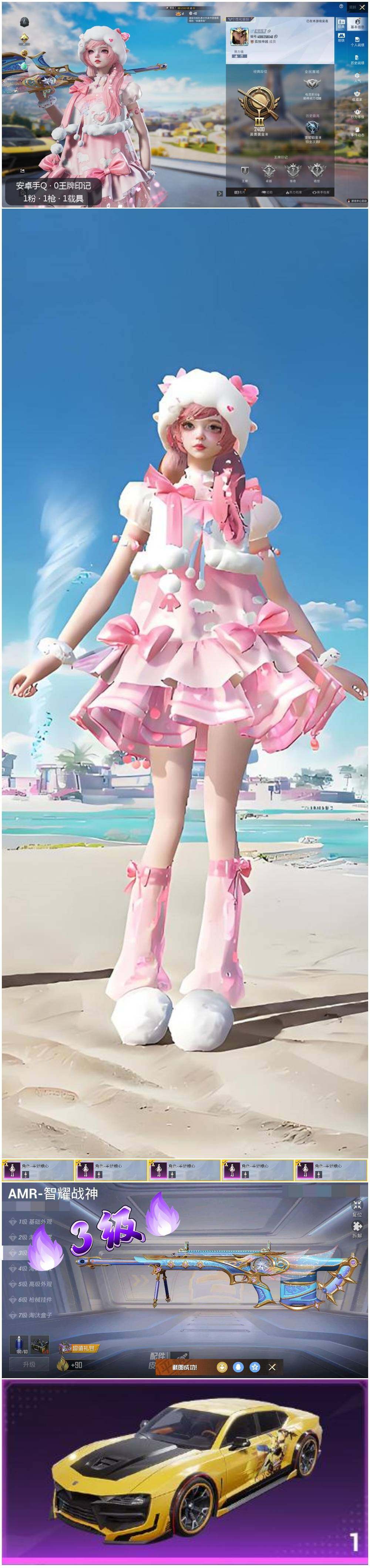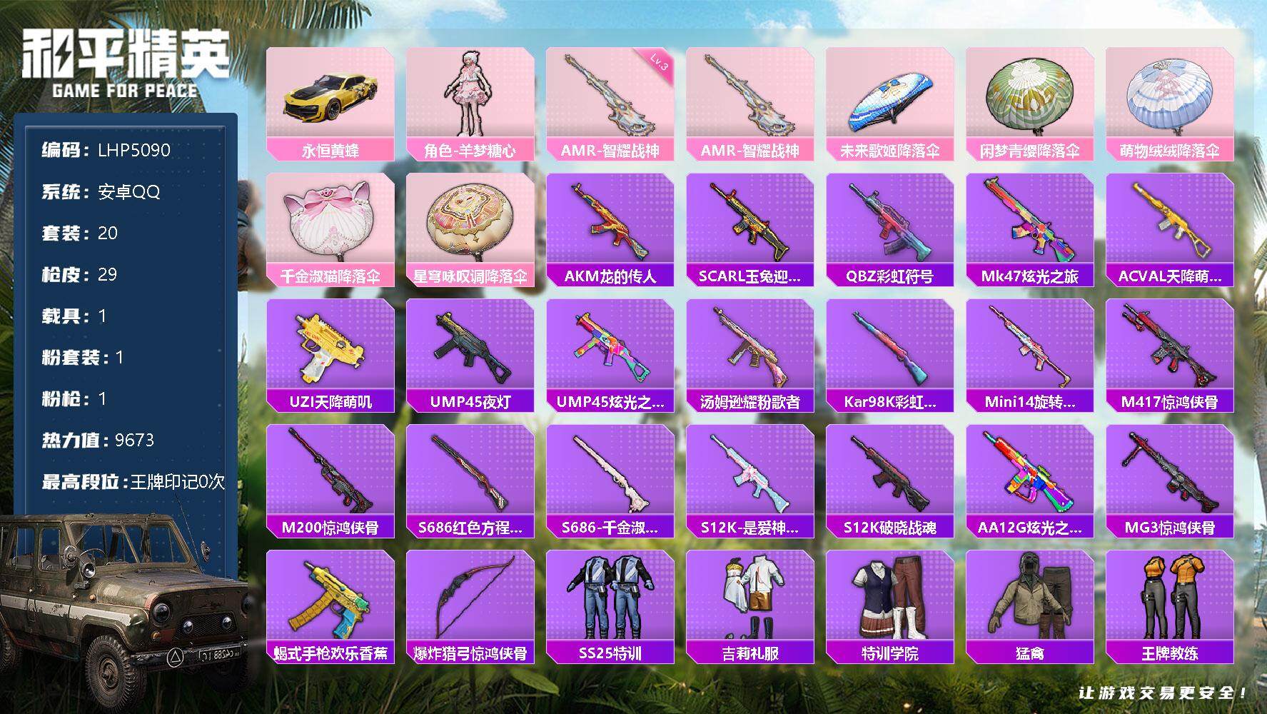 [12213347]【特价急出/详情看图】:安卓 手Q-1粉装-1特效枪-1载具-9673热力值-20套装-29枪皮【粉色载具】:永恒黄蜂【粉色套装】:角色-羊梦糖心【粉色枪皮等级】:AMR-智耀战神(三级)