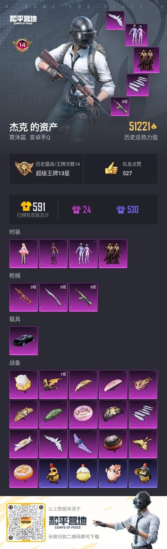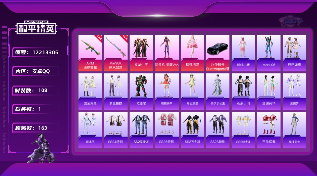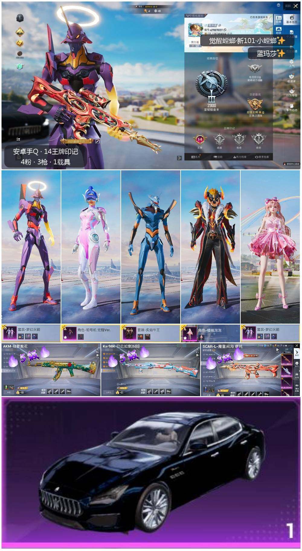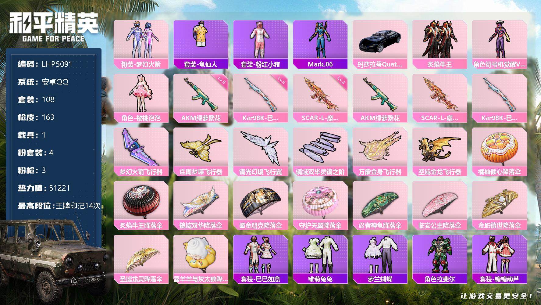 [12213305]素材身法号【特价急出/详情看图】:安卓 手Q-4粉装-3特效枪-1载具-6粉色飞行器-5.1w热力值-14王牌印记-108套装-163枪皮【热门品类】:粉装-梦幻火箭,套装-龟仙人,套装-粉红小猪,角色-Mark.06【粉色载具】:玛莎拉蒂Quattroporte(夜幕蓝)【粉色套装】:粉装-梦幻火箭,粉装-炙焰牛王,角色-初号机 觉醒Ver.,角色-樱桃泡泡【粉色枪皮等级】:AKM-绿萝繁花(五级),SCAR-L-魔童闹海 哪吒(三级),Kar98K-巳巳如意(五级)【粉色飞行器】:梦幻火箭飞行器,庄周梦蝶飞行器,镜光幻境飞行翼,镜域双华-灵镜之阶,万象金身飞行器,圣域金龙飞行器