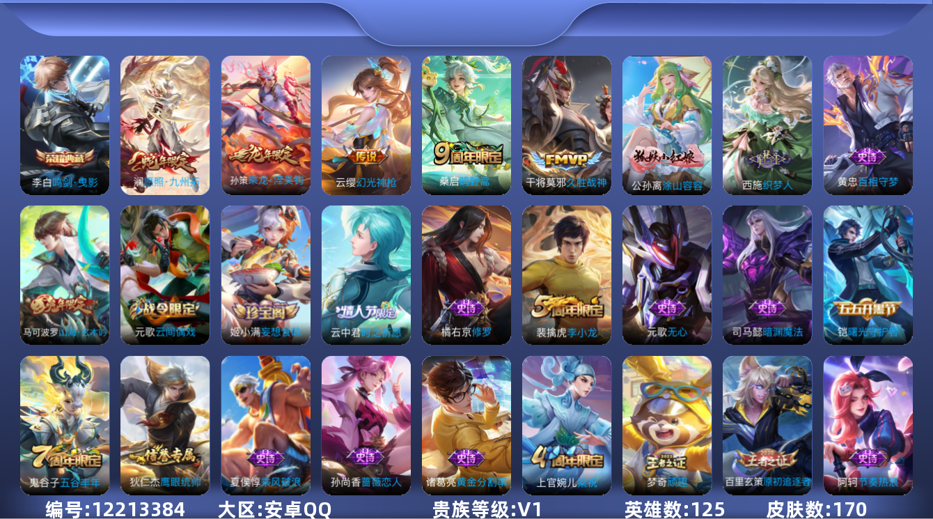 - [12284831]V8 1典藏 16传说 125英雄 237皮肤 可修改实名 优质装备:弑枪猎影(韩信典藏),久胜战神,地狱火,仲夏夜之梦(大飞蛾),山海·炽霜斩(李信年限),山海·苍雷引(电光曜子),炽翼辉光(娃娃菜牛角包),鹤归松栖(云缨),霜月吟,澜逐花归海,涂山容容 珍宝阁皮:万物之道,优雅恋人 限定皮:至尊宝,异界灵契(白毛香),傲雪梅枪,神威(电光马子),飞衡(韩信年限),遇见飞天,高山流水,诗剑行,怒海麟威,五谷丰年,梁祝,天狼狩猎者,龙胆,李小龙,如梦令-后羿,默契交锋-花木兰,引擎之心,美猴王,寅虎·赤拳(老虎年限),深海之息(深海大菠萝),枫霜尽,山海·玄木吟(马可年限) 史诗皮:龙之律动,百相守梦-周瑜,百相守梦-黄忠,紫霞仙子,电玩小子(小书包),黄金分割率,特工魅影,永昼,冰冠公主,真我赫兹(百里守约),江河有灵,蒙恬荣光圣徽,魅语,电玩·爆裂旋风,无限星赏官,晚萤,猫狗日记-孙策,节奏热浪,修罗,女仆咖啡,摇滚巨星,水果甜心,天才门将,星夜王子,心灵骇客,功夫厨神,暗隐猎兽者,幽灵船长,鬼剑武藏,心灵战警,舞动绿茵,地狱岩魂,纤云弄巧,拒霜思,缤纷独角兽,乘风破浪,逐浪之夏,水晶猎龙者,曙光守护者,箭羽风息,唤灵魅影,金属风暴,圣诞狂欢,圣诞恋歌,鹰眼统帅,暗夜贵公子,魅力维加斯,黎明之约,无心,未来纪元-赵云,玫瑰异探