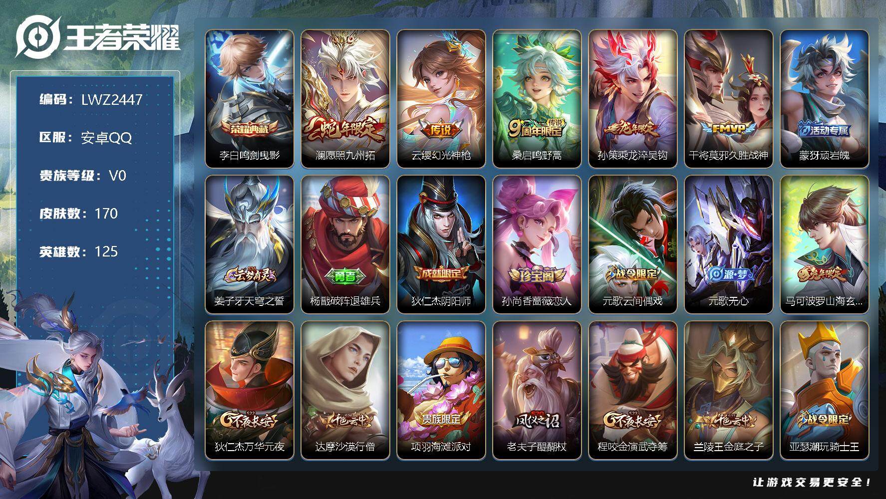 [12213384]【特价急出/详情看图】:安卓Q-V0-永恒钻石I段位-125英雄-170皮肤-1典藏-5传说-40史诗 【荣耀典藏】:李白鸣剑曳影 【传说皮肤】:澜愿照九州拓,云缨幻光神枪,桑启鸣野蒿,孙策乘龙淬吴钩,干将莫邪久胜战神 【限定皮肤】:蒙犽顽岩魄,姜子牙天穹之誓,杨戬破阵退雄兵,狄仁杰阴阳师,孙尚香蔷薇恋人,元歌云间偶戏,元歌无心,马可波罗山海玄木吟,狄仁杰万华元夜,达摩沙漠行僧,项羽海滩派对,老夫子醍醐杖,程咬金演武夺筹,兰陵王金庭之子,亚瑟潮玩骑士王,李元芳云中旅人,钟馗驱傩正仪,太乙真人华丽摇滚,鬼谷子原初探秘者,鬼谷子五谷丰年,苏烈千军破阵,百里玄策原初追逐者,梦奇顽趣,沈梦溪大漠名商,裴擒虎李小龙,裴擒虎擒涛扼浪,云中君时之祈愿,上官婉儿梁祝,鲁班大师探海日志,桑启海盐诗旅,张良古海寻踪,鬼谷子天穹祈灯,姬小满妄想食味,孙策乘龙淬吴钩,刘邦剑破天穹,程咬金群星魔术团,周瑜熔金海岸 【年限皮肤】:马可波罗山海玄木吟,孙策乘龙淬吴钩 【赛季限定】:狄仁杰万华元夜,达摩沙漠行僧,老夫子醍醐杖,程咬金演武夺筹,兰陵王金庭之子,张良古海寻踪,李元芳云中旅人,钟馗驱傩正仪,鬼谷子原初探秘者,苏烈千军破阵,百里玄策原初追逐者,梦奇顽趣,沈梦溪大漠名商,裴擒虎擒涛扼浪,鲁班大师探海日志,桑启海盐诗旅,鬼谷子天穹祈灯,刘邦剑破天穹,姜子牙天穹之誓 【战令限定】:元歌云间偶戏,亚瑟潮玩骑士王 【史诗皮肤】:赵云未来纪元,貂蝉圣诞恋歌,王昭君偶像歌手,宫本武藏鬼剑武藏,孙尚香蔷薇恋人,孙尚香水果甜心,嬴政暗夜贵公子,嬴政摇滚巨星,墨子金属风暴,张飞乱世虎臣,刘邦德古拉伯爵,夏侯惇乘风破浪,诸葛亮黄金分割率,亚瑟心灵战警,铠曙光守护者,蔡文姬舞动绿茵,刘禅天才门将,李元芳逐浪之夏,程咬金功夫厨神,阿轲节奏热浪,孙策猫狗日记,大乔猫狗日记,狄仁杰鹰眼统帅,上官婉儿梁祝,橘右京修罗,百里玄策原初追逐者,裴擒虎李小龙,元歌云间偶戏,司马懿暗渊魔法,云中君时之祈愿,鬼谷子五谷丰年,元歌无心,梦奇顽趣,马可波罗山海玄木吟,姬小满妄想食味,蒙犽顽岩魄,牛魔星界战将,黄忠百相守梦,西施织梦人,公孙离涂山容容 【其他皮肤】:项羽海滩派对,韩信教廷特使,达摩大发明家,赵云白执事,赵云忍炎影,白起白色死神,扁鹊化身博士,扁鹊救世之瞳,宫本武藏未来纪元,安琪拉玩偶对对碰,孙膑天使之翼,妲己少女阿狸,典