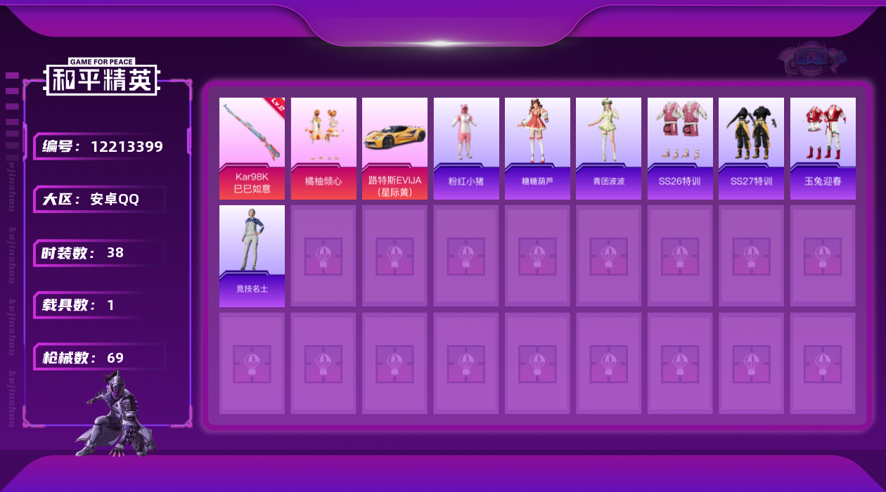 - PX_2093678- 安卓手Q-2王牌印记-9粉装-3特效枪-1载具-31311热力值-67套装-85枪皮-0卓越印记-0传奇印记 【9粉装】,梦幻火箭,宝贝奶油派,天使彩虹糖,新星烈龙,木曜青龙,霓裳武神,狩月元帅,鸾凤武仙,金丰海韵 【3特效枪】M416-五爪金龙-6级 Kar98K-巳巳如意-5级 M24-翩跹演武-4级 【1稀有紫装】,龟仙人, 【1稀有载具】,玛莎拉蒂Quattrop