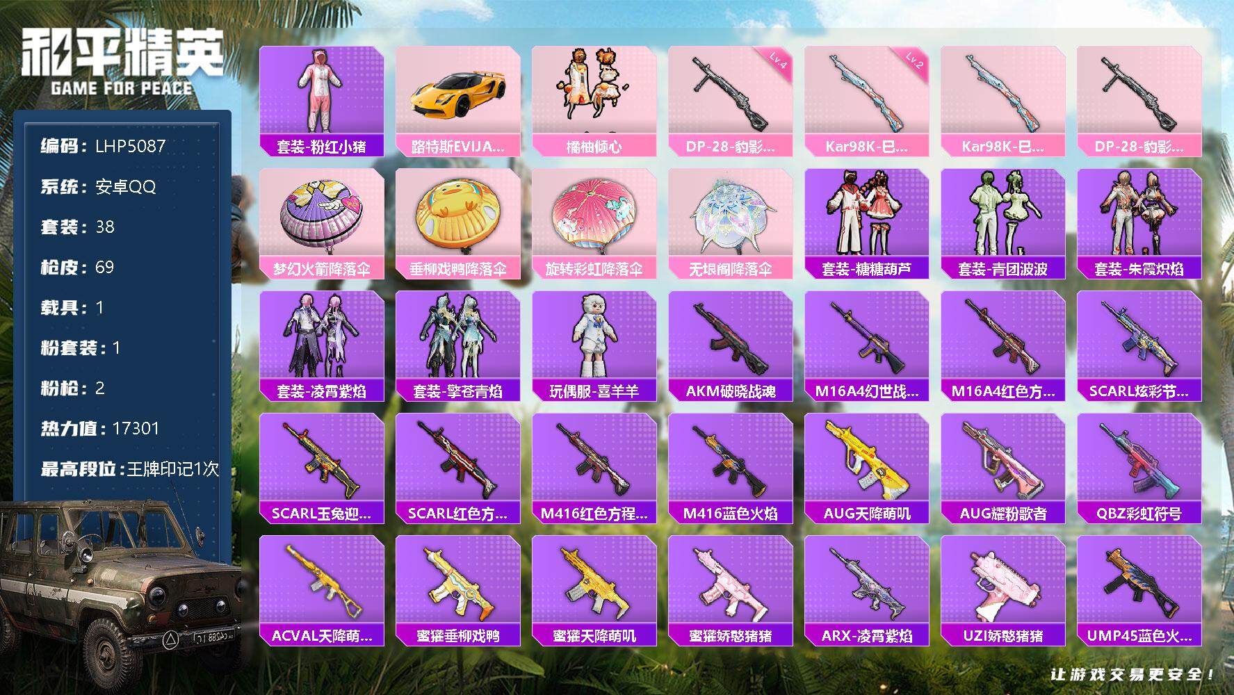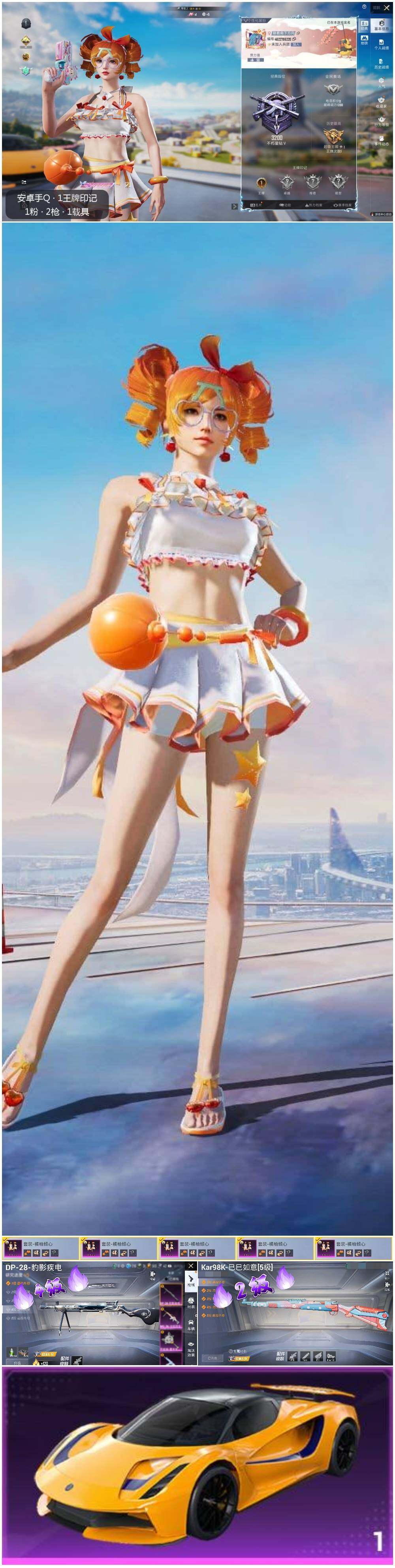 [12213399]【特价急出/详情看图】:安卓 手Q-1粉装-2特效枪-1载具-1.7w热力值-1王牌印记-38套装-69枪皮【热门品类】:套装-粉红小猪【粉色载具】:路特斯EVIJA(星际黄)【粉色套装】:粉装-橘柚倾心【粉色枪皮等级】:Kar98K-巳巳如意(二级),DP-28-豹影疾电(四级)