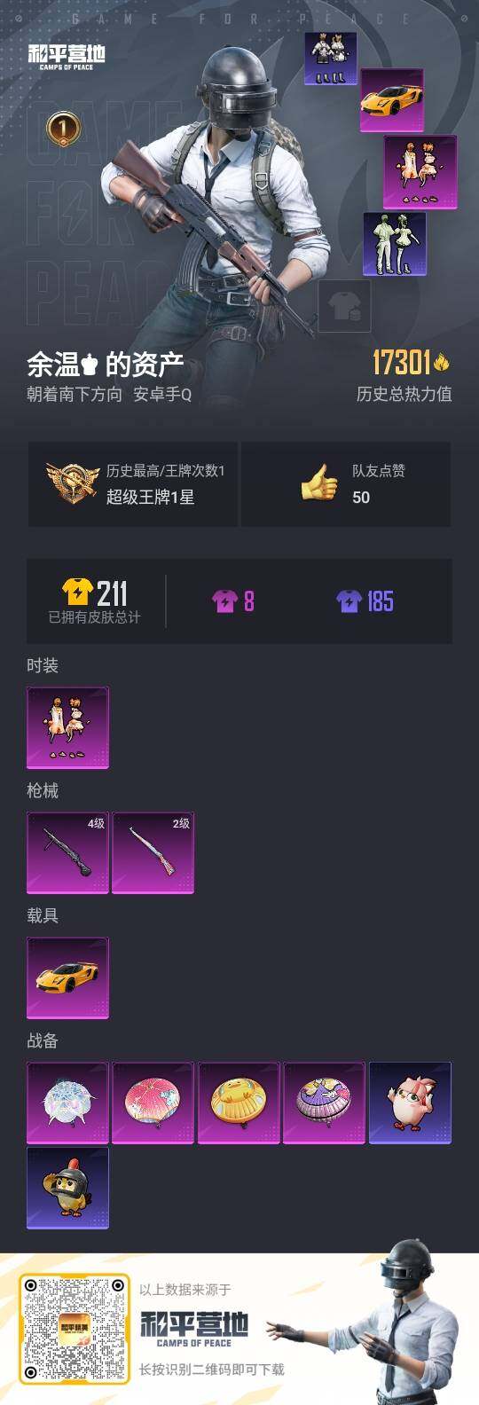 - [11234993]实名: 可修改 时装数: 332 枪械数: 145 战备数: 78 热门装扮: 炫光之旅,圣堂之誓,星穹咏叹调 稀有枪皮: AMR炫光之旅,AKM绿萝繁花,GROZA-镜光银凌,Kar98K-巳巳如意,M762-鬼刀,AUG-暖羊咩咩,MK14-甜梦熊击