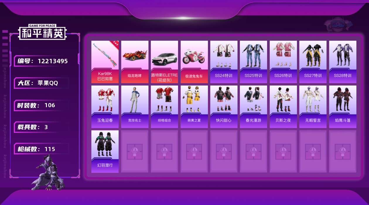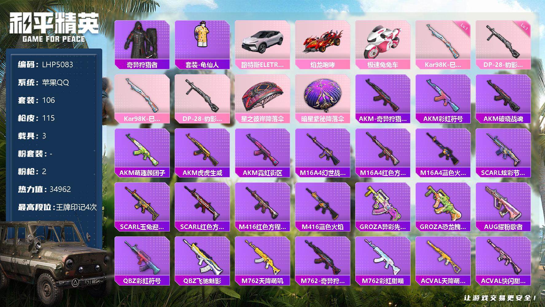 [12213495]【特价急出/详情看图】:苹果 手Q-2特效枪-3载具-3.4w热力值-4王牌印记-106套装-115枪皮【热门品类】:套装-奇异狩猎者,套装-龟仙人【粉色载具】:路特斯ELETRE(花绽灰),焰龙咆哮,极速兔兔车【粉色枪皮等级】:Kar98K-巳巳如意(一级),DP-28-豹影疾电(一级)