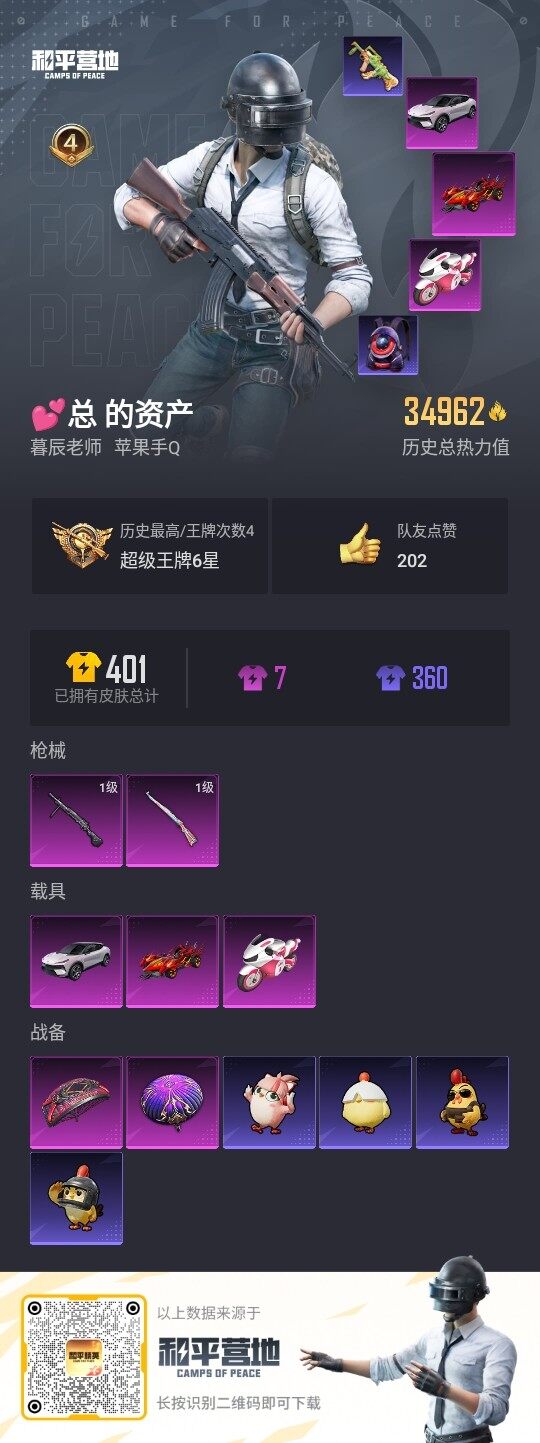 - [10354669]实名: 可修改 时装数: 621 载具数: 3 枪械数: 233 战备数: 160 热门装扮: 奇异狩猎者,呆萌铁蟹,筑梦精灵,大橘为重,圣堂之誓,萨利娅 载具: 布加迪威龙(律动橙),宝马i8(离子银) 稀有枪皮: Kar98K-巳巳如意,M200-伏羲圣卦,M762-鬼刀,AUG-暖羊咩咩