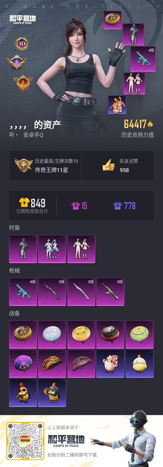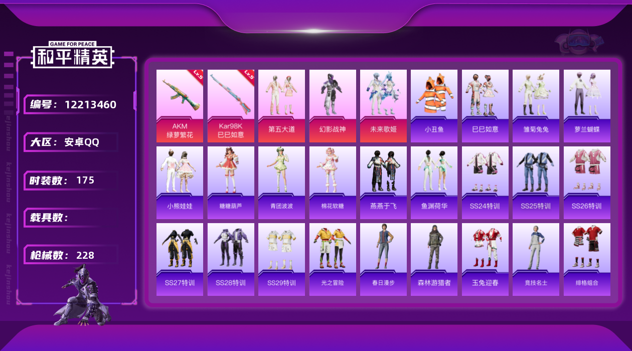 - PX_2097196- 安卓手Q-15王牌印记-14粉装-7特效枪-3载具-83345热力值-174套装-255枪皮-2卓越印记-1传奇印记 【14粉装】,梦幻火箭,2号机款机体服,千面幻镜,冷漠罗丽,罗征,金曜白虎,星之信仰,小可学妹,赤焰黑爵,萨利娅,星梦奇缘,未来歌姬,音爆索尼克,未来战士 【7特效枪】AKM-梦之光华-6级 SCAR-L-青春物语-6级 M416-五爪金龙-7级 AUG-许
