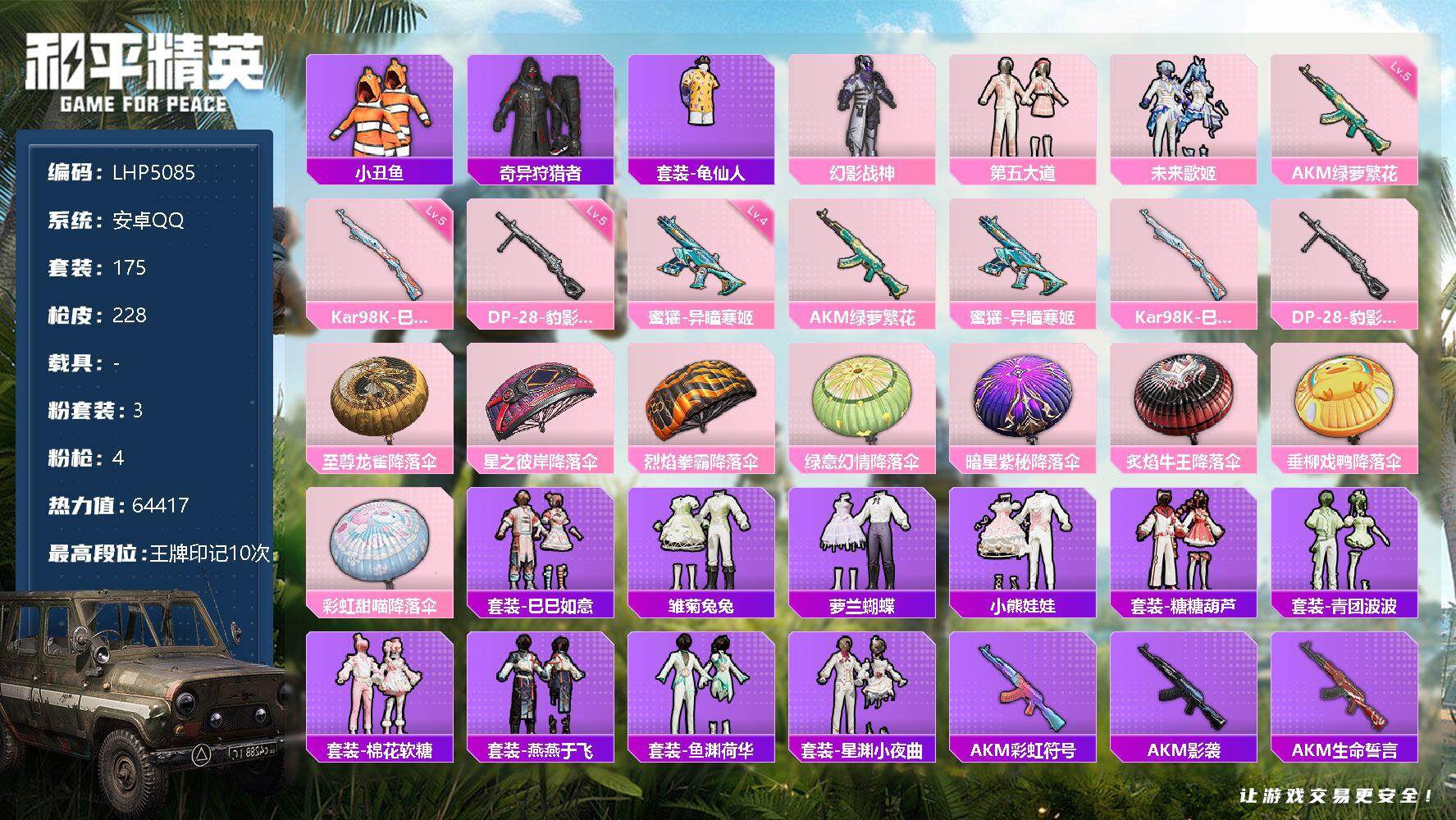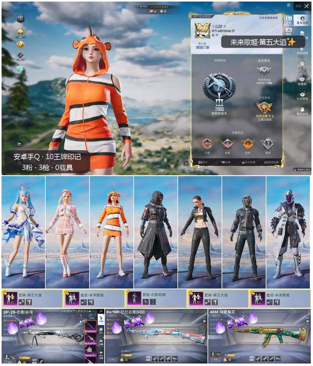 [12213460]地铁满天赋【特价急出/详情看图】:安卓 手Q-3粉装-4特效枪-6.4w热力值-10王牌印记-175套装-228枪皮【热门品类】:套装-小丑鱼,套装-奇异狩猎者,套装-龟仙人【粉色套装】:粉装-幻影战神,粉装-第五大道,粉装-未来歌姬【粉色枪皮等级】:AKM-绿萝繁花(五级),蜜獾-异瞳寒姬(四级),Kar98K-巳巳如意(五级),DP-28-豹影疾电(五级)