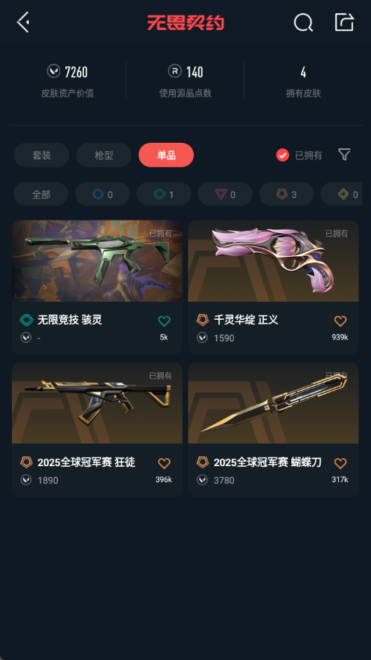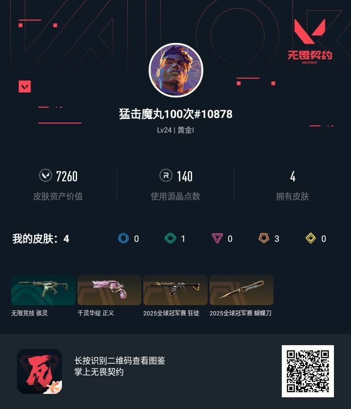 [12213626]皮肤资产价值7260【套装】:2025全球冠军赛套装 【英雄】:炼狱,壹决,铁臂,捷风,雷兹,不死鸟,贤者,猎枭,芮娜,奇乐,尚勃勒,霓虹 【近战 武器】:近战武器-2025全球冠军赛 蝴蝶刀 【狂徒】:狂徒-2025全球冠军赛 【骇灵】:骇灵-无限竞技 【正义】:正义-千灵华绽 【卡面】:《双城之战》金克丝 卡面,代号红色 卡面,新兵报到 卡面,V契约 卡面,无畏契约 卡面 【喷漆】:霓光四射 喷漆,关门放狗 喷漆,胜利属于无畏契约 喷漆,GLHF 喷漆,无畏契约 喷漆 【挂饰】:无畏契约GO!第一卷 零 挂饰,无畏契约 纪念币 挂饰