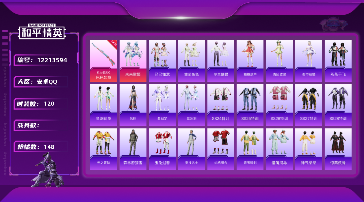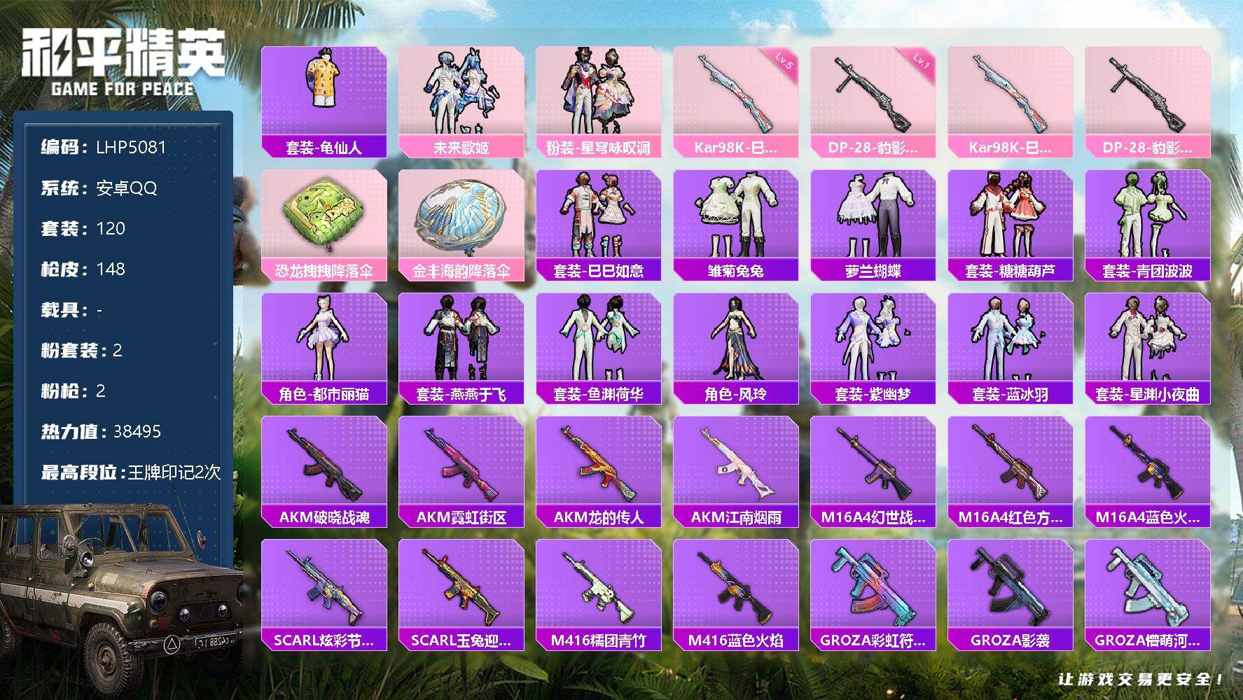 [12213594]地铁满天赋【特价急出/详情看图】:安卓 手Q-2粉装-2特效枪-3.8w热力值-2王牌印记-120套装-148枪皮【热门品类】:套装-龟仙人【粉色套装】:粉装-未来歌姬,粉装-星穹咏叹调【粉色枪皮等级】:Kar98K-巳巳如意(五级),DP-28-豹影疾电(一级)
