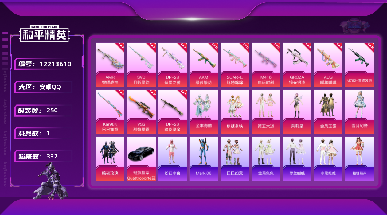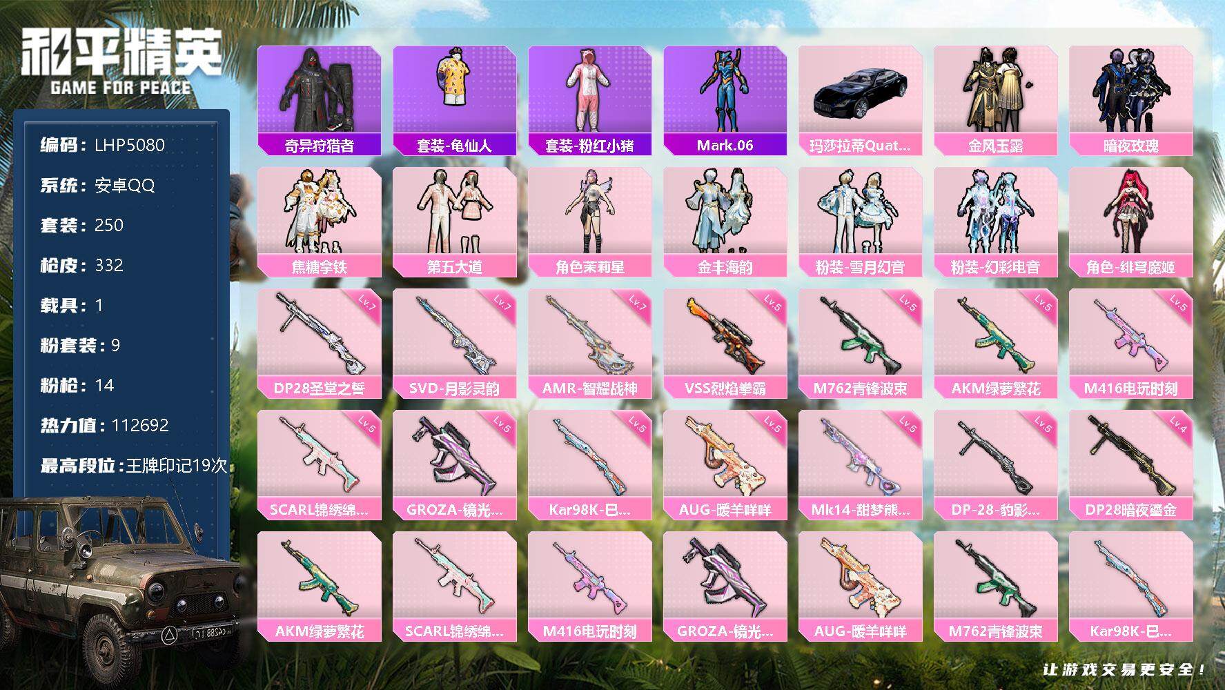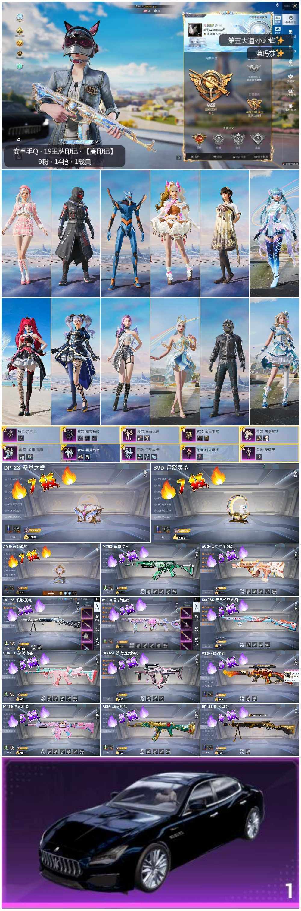[12213610]素材身法号/地铁满天赋【特价急出/详情看图】:安卓 手Q-9粉装-14特效枪-1载具-5粉色飞行器-11.2w热力值-19王牌印记-250套装-332枪皮【热门品类】:套装-奇异狩猎者,套装-龟仙人,套装-粉红小猪,角色-Mark.06【粉色载具】:玛莎拉蒂Quattroporte(夜幕蓝)【粉色套装】:粉装-金风玉露,粉装-暗夜玫瑰,粉装-焦糖拿铁,粉装-第五大道,角色-茉莉星,粉装-金丰海韵,粉装-雪月幻音,粉装-幻彩电音,角色-绯穹魔姬【粉色枪皮等级】:AKM-绿萝繁花(五级),SCAR-L-锦绣绵绵(五级),M416-电玩时刻(五级),GROZA-镜光银凌(五级),AUG-暖羊咩咩(五级),M762-青锋波束(五级),Kar98K-巳巳如意(五级),VSS-烈焰拳霸(五级),Mk14-甜梦熊击(五级),AMR-智耀战神(七级),SVD-月影灵韵(七级),DP-28-暗夜鎏金(四级),DP-28-圣堂之誓(七级),DP-28-豹影疾电(五级)【粉色飞行器】:萌物绒绒飞行器,墨金战记飞行器,雀灵庇佑飞行器,时光之吻飞行器,灵猫魔法师飞行器