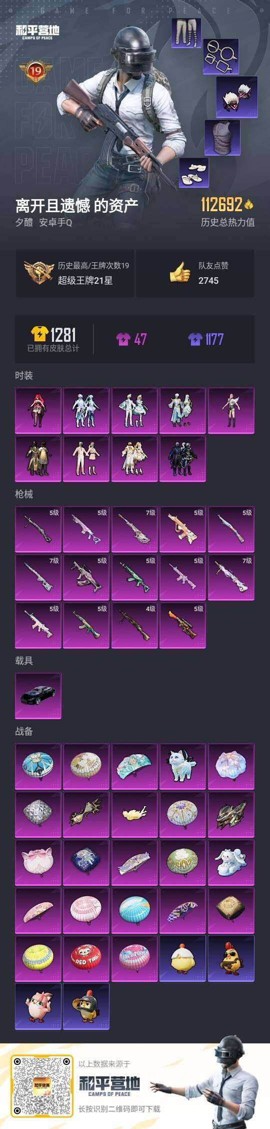 - PX_2101794- 苹果手Q-5王牌印记-8粉装-8特效枪-5载具-75531热力值-154套装-179枪皮-1卓越印记-1传奇印记 【8粉装】,梦幻火箭,放客神游,怪诞乔克,星穹咏叹调,狂魅哈莉,千金淑猫,精灵迷巫,绚金战神 【8特效枪】AKM-幽焰骑士-3级 SCAR-L-锦绣绵绵-5级 M416-风花雪月-7级 M416-五爪金龙-1级 Kar98K-巳巳如意-5级 M24-星之信仰-6