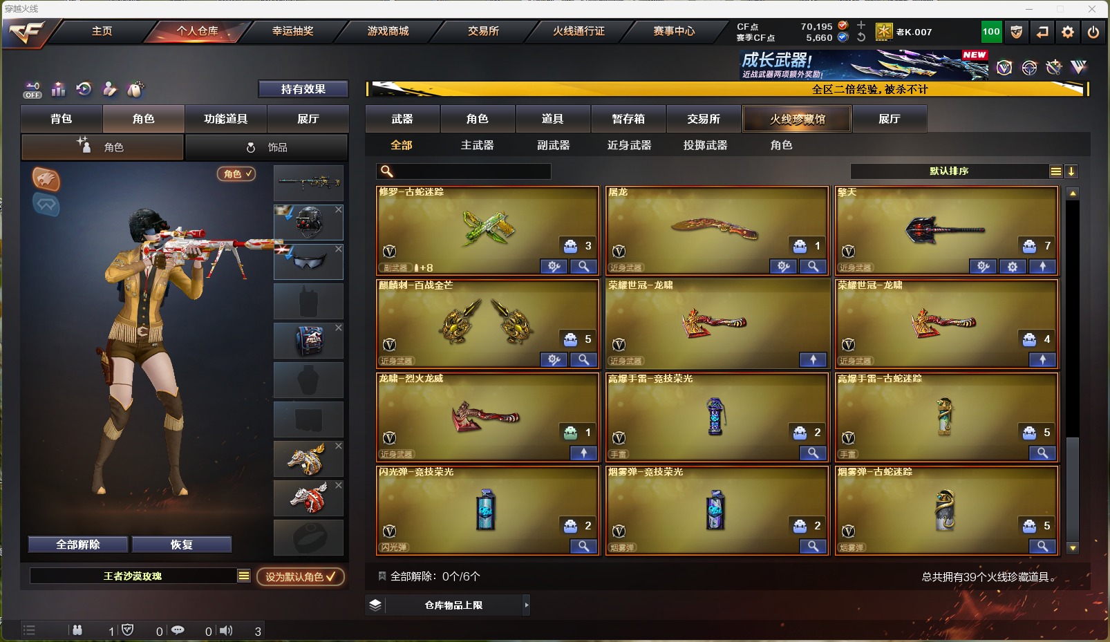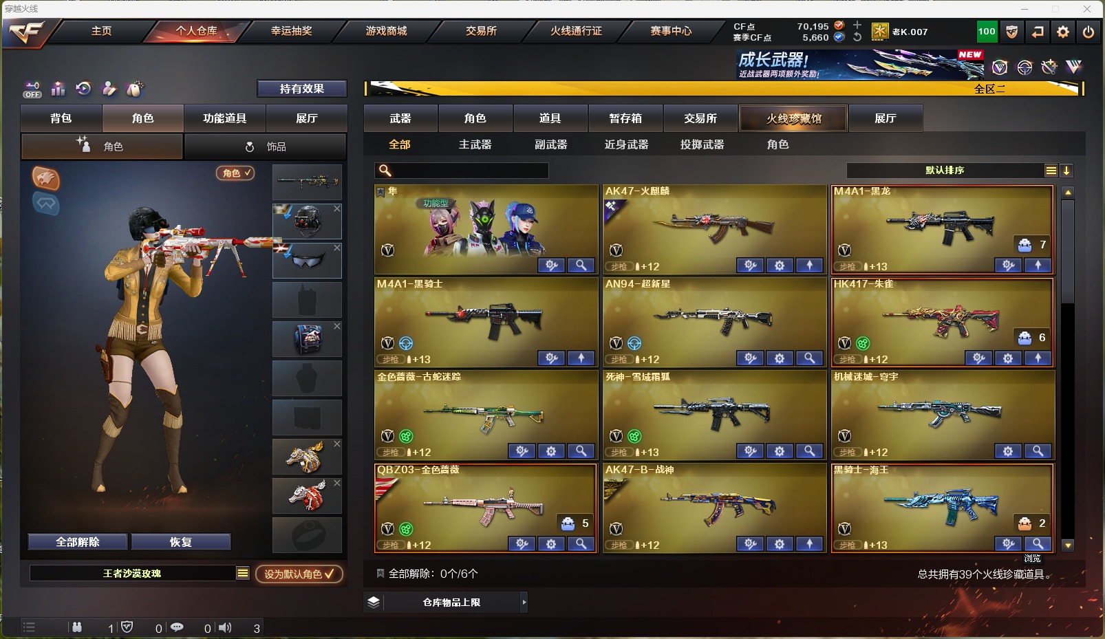 [12213864]1传说角色 2炫金武器 39V武器 可二次 可修改实名 优质装备:M200-幻神,QBZ03-金色蔷薇,白虎-电玩蓝兔,AK47-火麒麟,M4A1-黑骑士,M4A1-黑龙,Barrett-极光,AWM-裁决,AA-12-雷霆,AN94-超新星,HK417-朱雀,汤姆逊-烈龙,沙鹰-修罗,沙鹰-天神,屠龙,擎天,Barrett-暗月传说,龙啸-烈火龙威,金色蔷薇-古蛇迷踪,修罗-古蛇迷踪,死神-雪域霜狐,Barrett-碧霄极光,麒麟刺-百战金芒,炼狱-百战金芒,机械迷城-穹宇,USP-冥王 排位资格:有 V武器:AK47-B-战神,黑骑士-海王 炫金武器:炫金超新星,炫金天龙