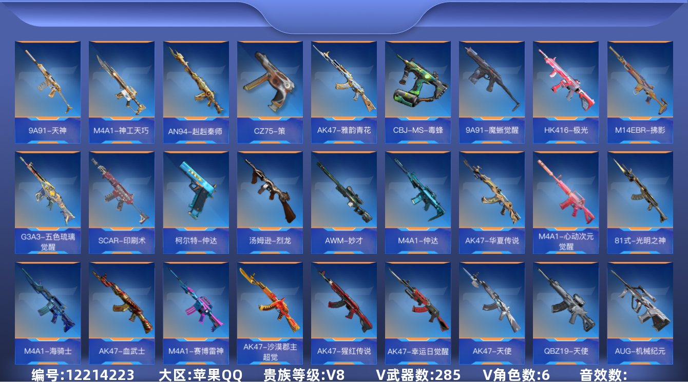 [12214223]V8 13王者武器 285英雄武器 6英雄角色 可二次 可修改实名 优质装备:M4A1-仲达,AWM-妙才,CZ75-策 v武器:M14EBR-拂影,G3A3-五色琉璃觉醒,SCAR-印刷术,M4A1-猎神,SCAR-探星者,PP19野牛-造纸术,打击者-天神,AN94-赳赳秦师,AK47-雅韵青花,CBJ-MS-毒蜂,9A91-魔蜥觉醒,HK416-极光,柯尔特-仲达,加特林-堡垒,AWM-天使,98K-星神,QBB95-极光,QCW05-变形金刚·大黄蜂,AN94-四凶觉醒,M4A1-堕天神,9A91-天神,M4A1-神工天巧,SCAR-幽暗骑士,M4A1-玫瑰精灵,M200-心动次元觉醒,AK47-火麒麟,M4A1-雷神,AK47-无影,M4A1-黑骑士,AK47-麒麟,M4A1-黑龙,剑齿虎,M4A1-死神,AK47-黑武士觉醒,M4A1-天使,AK47-沙漠领主,QBZ95-天使,AK12-天启,QBZ03-湮灭,剑齿虎-炫彩,AN94-超新星,AK47-角斗士,AK47-耀金伯爵,暗杀神,RPK-赤炎盘龙,MG3-雏凤,加特林-炼狱,加特林-堡垒觉醒,MG36-黑骑士,刘易斯-血月,加特林-蟒蛇,巴雷特-毁灭,巴雷特-极光,巴雷特-枪娘,09式狙-天神,巴雷特-变色龙,AWM-裁决,AK47-猩红传说,AK47-沙漠郡主-超觉,AK47-幸运日觉醒,AK47-天使,M4A1-赛博雷神,AK47-血武士,M4A1-海骑士,81式-光明之神,QBZ19-天使,M4A1-武圣,SCAR-幽暗骑士觉醒,AK47-英朗,AUG-机械纪元,QBZ95-幻兽,AK47-樱斗士-超觉,AK47-竞技战魂,AK47-机械迷城,AK47-变色龙,M14EBR-暗夜觉醒,AK47-黑鲨,M4A1-心动次元觉醒,AK47-华夏传说,亡命之徒-幻兽,双管猎枪-威侯,地狱火,嗜血金鲨,地狱烈炎,地狱烈樱·超觉,KSG-黑骑士,AA12-雷神,KSG-天蓬元帅,汤姆逊-烈龙,寒霜烈龙,双持斯泰尔-天使,MK5-机械纪元,斯泰尔-恶魔,斯泰尔-幻兽,A180-地狱凤凰,GLOCK18-武圣,蟒蛇-妙才 王者武器:王者之蝶,M12S-雷霆王者,王者之神,王者之心,王者之烈,王者之光,王者之轮