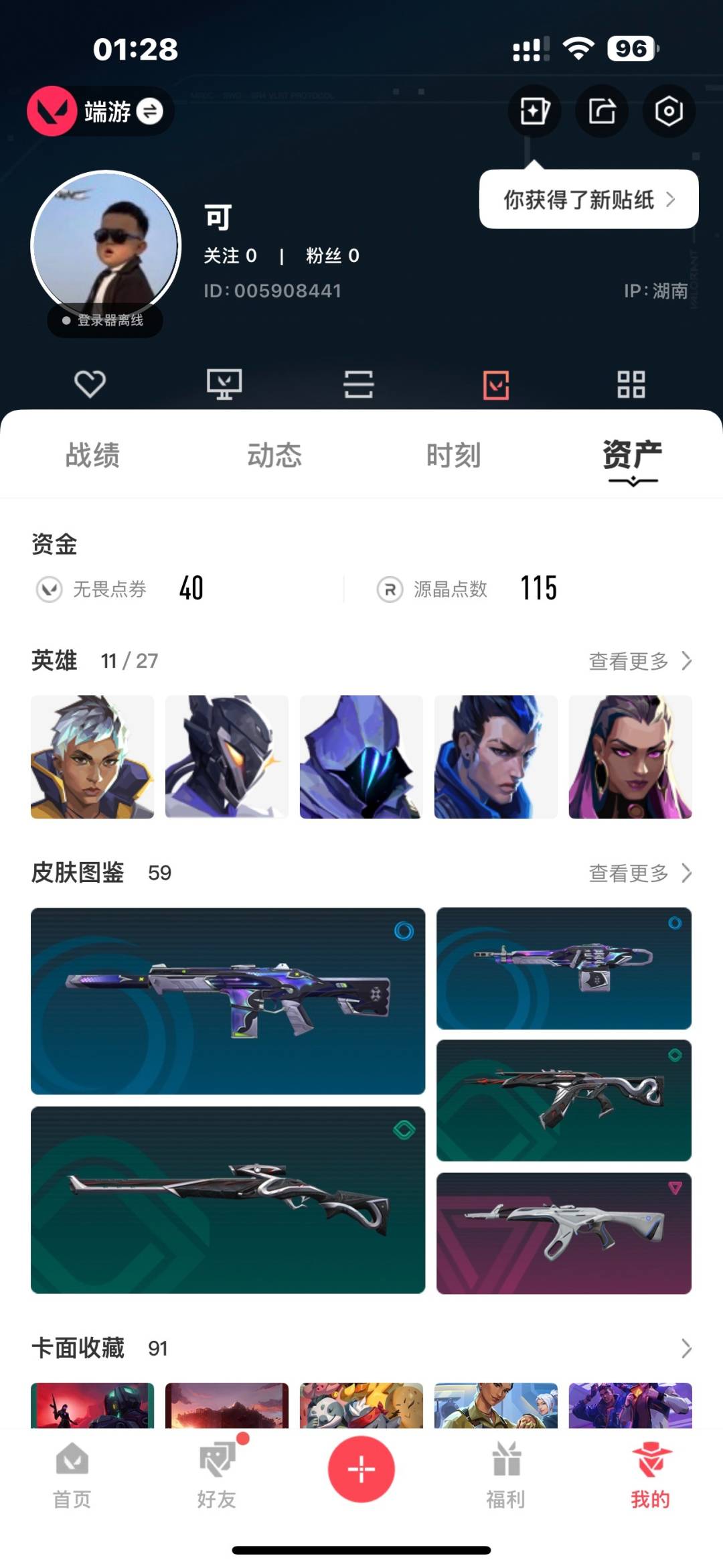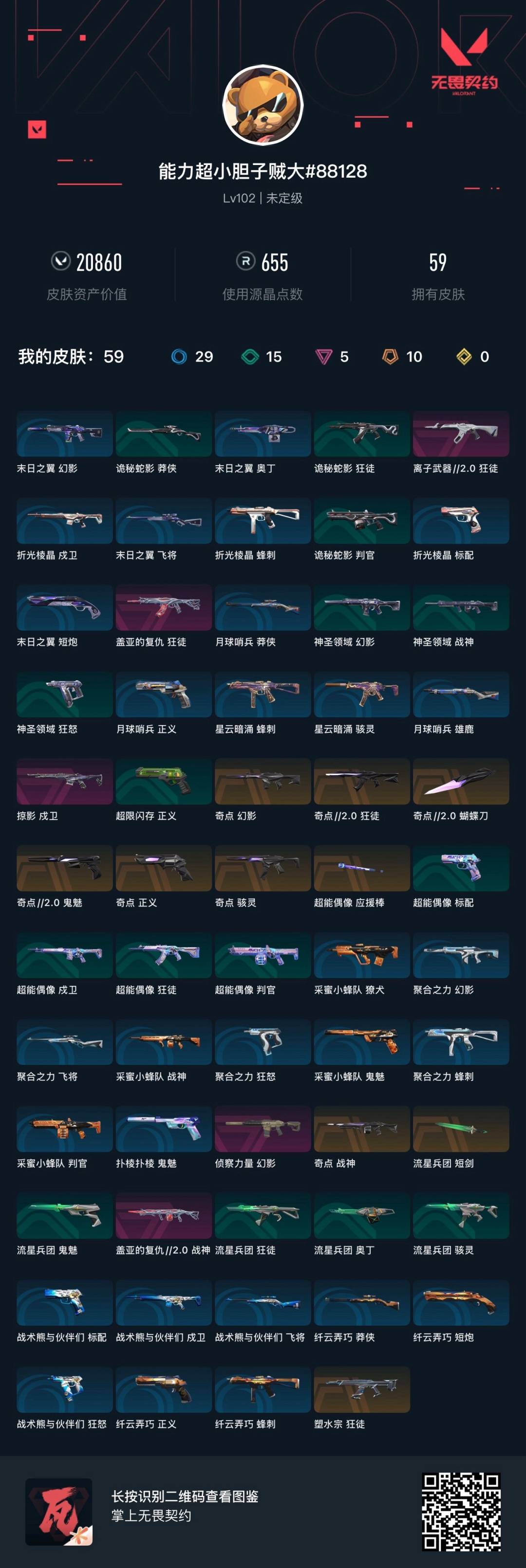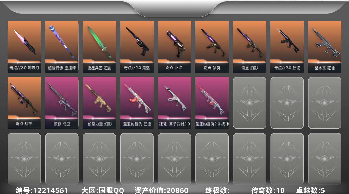 [12214561]10橙皮 5紫皮 59皮肤 11英雄 91卡面 655已用源晶 未定级 优质装备:奇点//2.0套装,正义-奇点,狂徒-塑水宗,幻影-奇点,狂徒-盖亚的复仇,幻影-侦察力量,狂徒-奇点//2.0,戍卫-掠影,骇灵-奇点,鬼魅-奇点//2.0,蝴蝶刀-奇点//2.0 步枪皮肤:狂徒-离子武器2.0 机枪皮肤:战神-奇点,战神-盖亚的复仇2.0 近战武器皮肤:短剑-流星兵团,超能偶像 应援棒