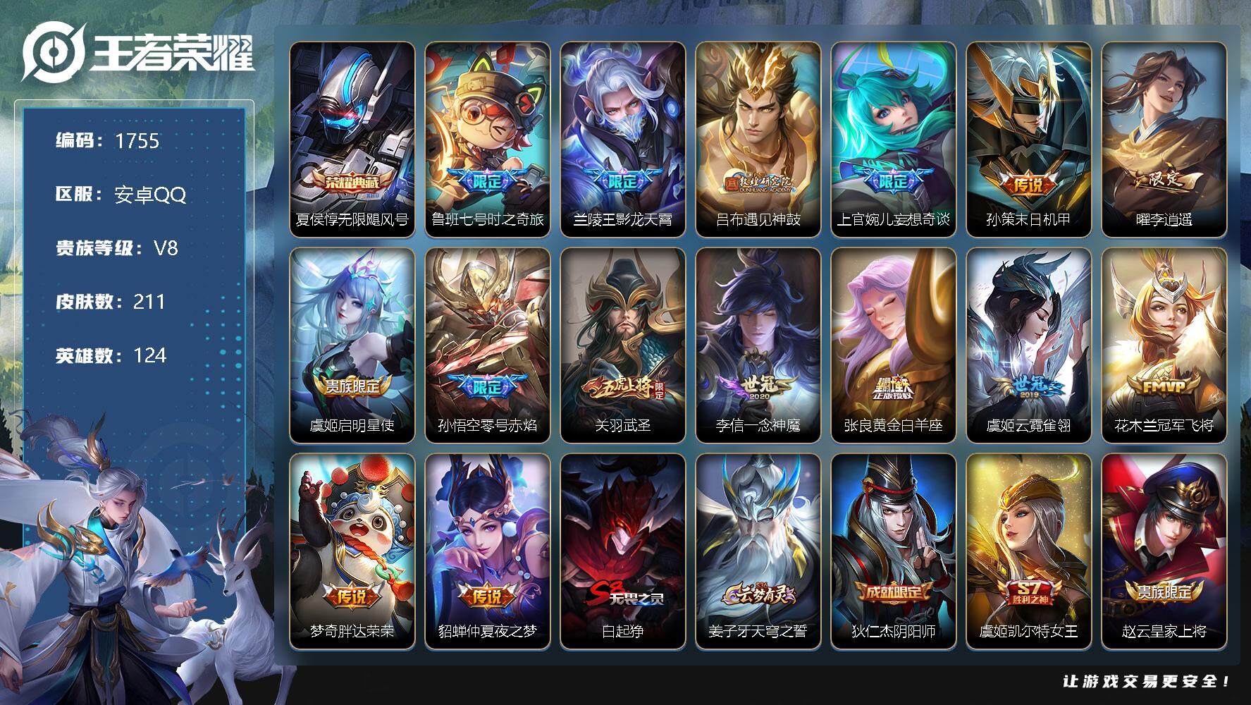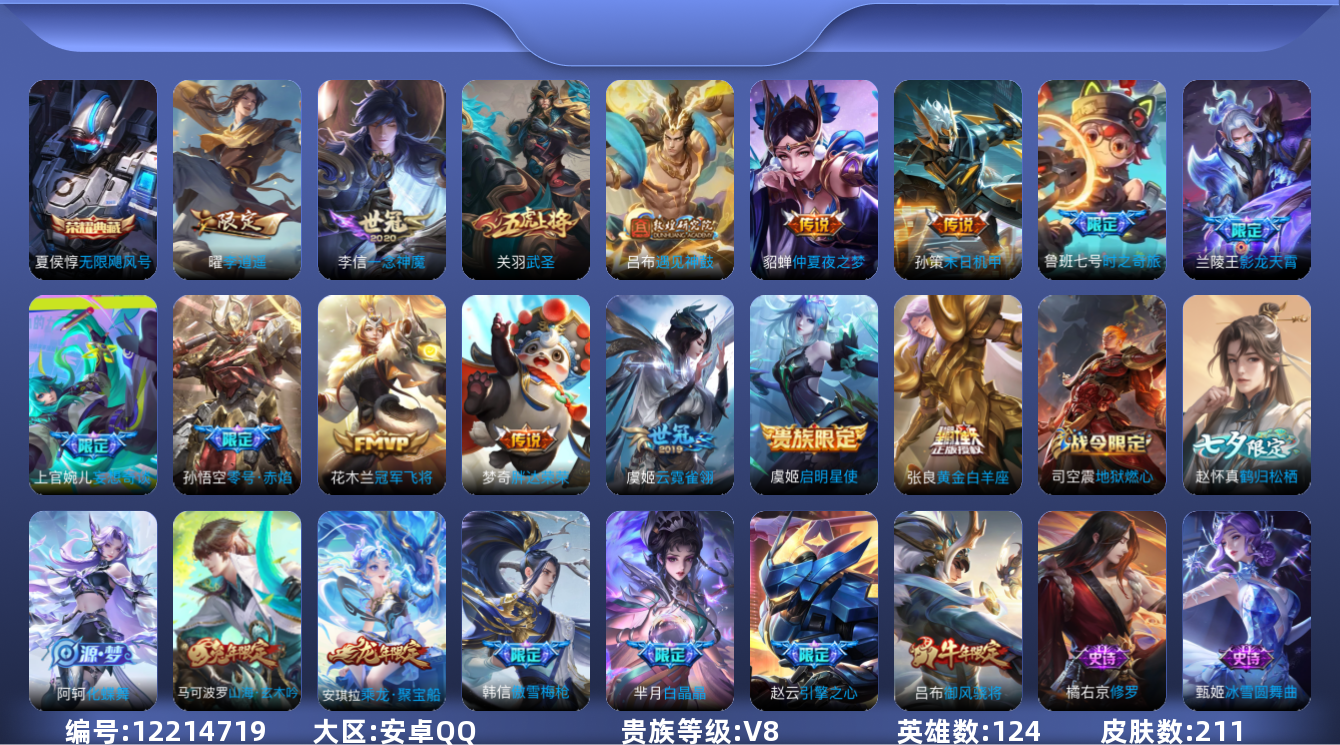 [12214719]【商品标题】:安卓Q-V3-尊贵铂金IV段位-124英雄-211皮肤-1典藏-0珍品无双-0无双-0珍品传说-15传说-57史诗