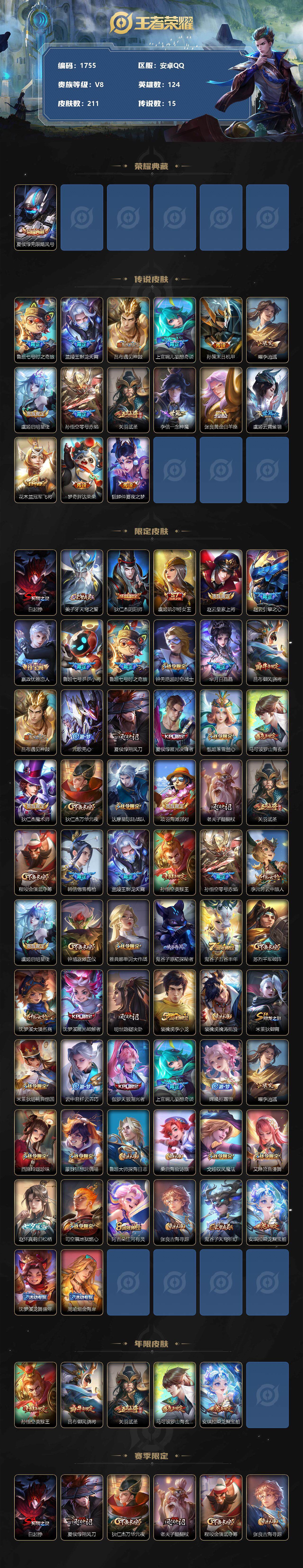 - [10992412]V7 1典藏 1珍品传说 4传说 122英雄 205皮肤 可修改实名 荣耀水晶:拾光映像(瑶典藏) 珍品传说:时之奇旅-孙策 传说皮:典韦战鼓燎原,地狱火,猫影幻舞 珍宝阁皮:妄想食味 限定皮:鸣野蒿,梅西,遇见飞天,梁祝,天狼溯光者,李小龙,大圣娶亲 史诗皮:茶境仙,器灵·浮梦炉,龙之律动,石田雨龙,百相守梦-百里守约,化蝶舞,苍穹之光,黄金分割率,特工魅影,千年之狐,龙骑士(小龙虾),末日机甲-吕布,修罗,女仆咖啡,摇滚巨星,水果甜心,星夜王子,德古拉伯爵,暗隐猎兽者,幽灵船长,鬼剑武藏,心灵战警,乐园奇幻夜,天秀·启明,地狱岩魂,纤云弄巧,缤纷独角兽,月团寄思,水晶猎龙者,曙光守护者,金属风暴,圣诞狂欢,圣诞恋歌,鹰眼统帅,魅力维加斯,未来纪元-赵云