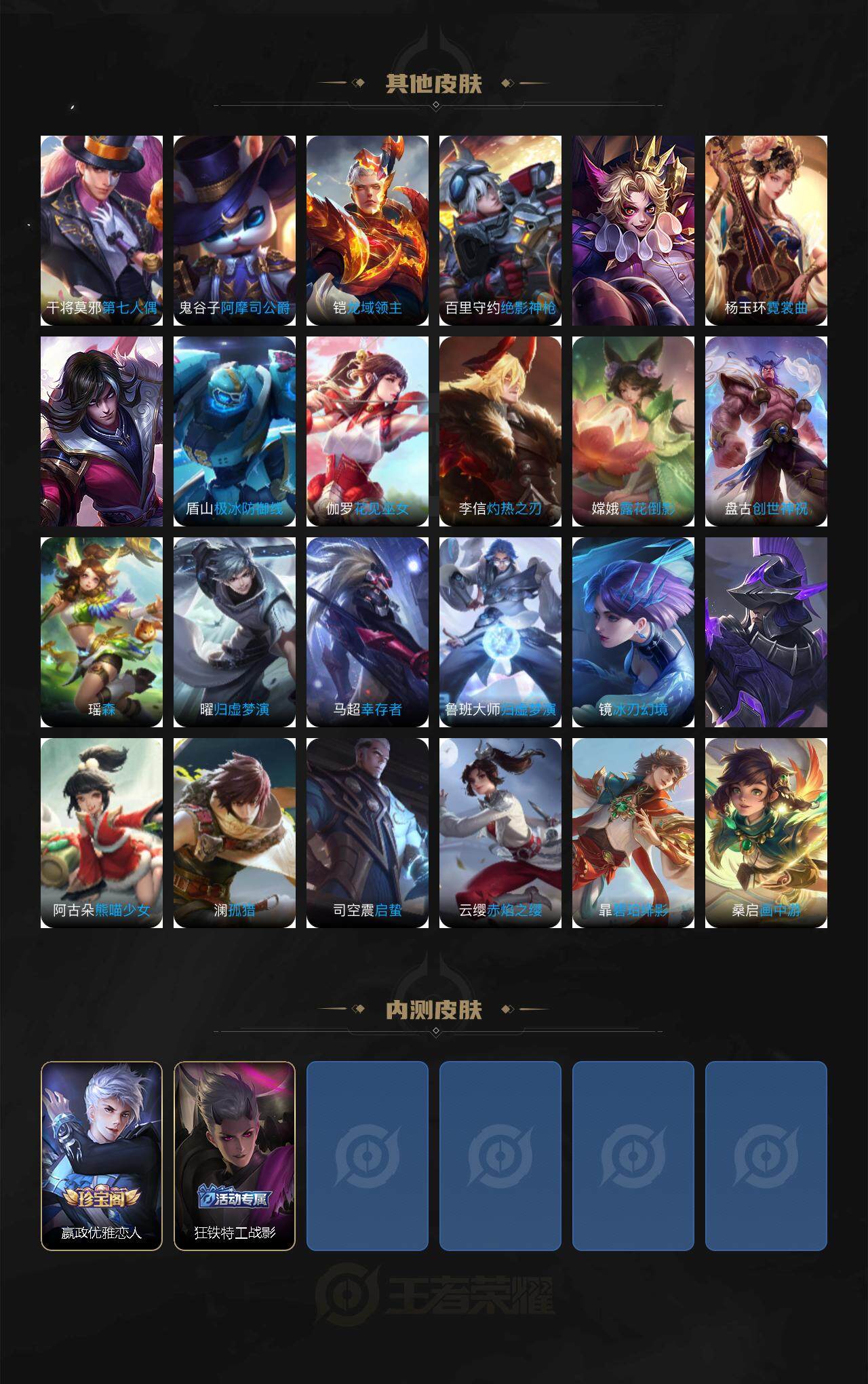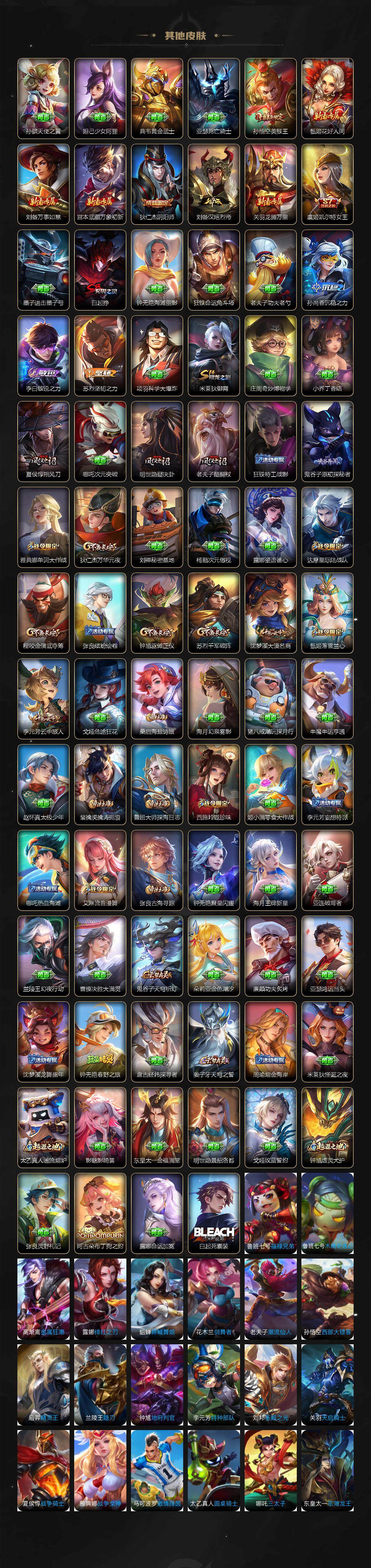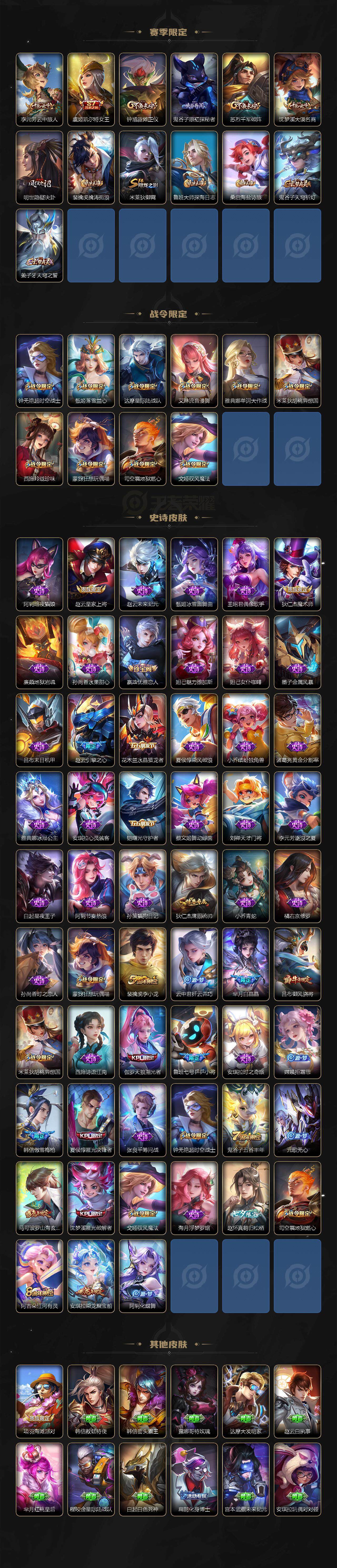 【限定皮肤】:白起狰,姜子牙天穹之誓,狄仁杰阴阳师,虞姬凯尔特女王,赵云皇家上将,赵云引擎之心,嬴政优雅恋人,鲁班七号乒乒小将,鲁班七号时之奇旅,钟无艳超时空战士,芈月白晶晶,吕布御风骁将,吕布遇见神鼓,元歌无心,夏侯惇朔风刀,夏侯惇匿光决锋者,甄姬落雪兰心,马可波罗山海玄木吟,狄仁杰魔术师,狄仁杰万华元夜,达摩星际陆战队,项羽海滩派对,老夫子醍醐杖,关羽武圣,程咬金演武夺筹,韩信傲雪梅枪,兰陵王影龙天霄,孙悟空美猴王,孙悟空零号赤焰,李元芳云中旅人,虞姬启明星使,钟馗驱傩正仪,雅典娜单词大作战,鬼谷子原初探秘者,鬼谷子五谷丰年,苏烈千军破阵,沈梦溪大漠名商,沈梦溪匿光破解者,明世隐疑决卦,裴擒虎李小龙,裴擒虎擒涛扼浪,米莱狄御霄,米莱狄胡桃异想国,云中君纤云弄巧,伽罗天狼溯光者,上官婉儿妄想奇谈,嫦娥拒霜思,曜李逍遥 ,西施玲珑珍味,蒙犽狂想玩偶喵,鲁班大师探海日志,桑启海盐诗旅,戈娅驭风魔法,艾琳流音漫舞,赵怀真鹤归松栖,司空震地狱燃心,阿古朵江河有灵,张良古海寻踪,鬼谷子天穹祈灯,安琪拉乘龙聚宝船,沈梦溪龙舞盛年,周瑜熔金海岸