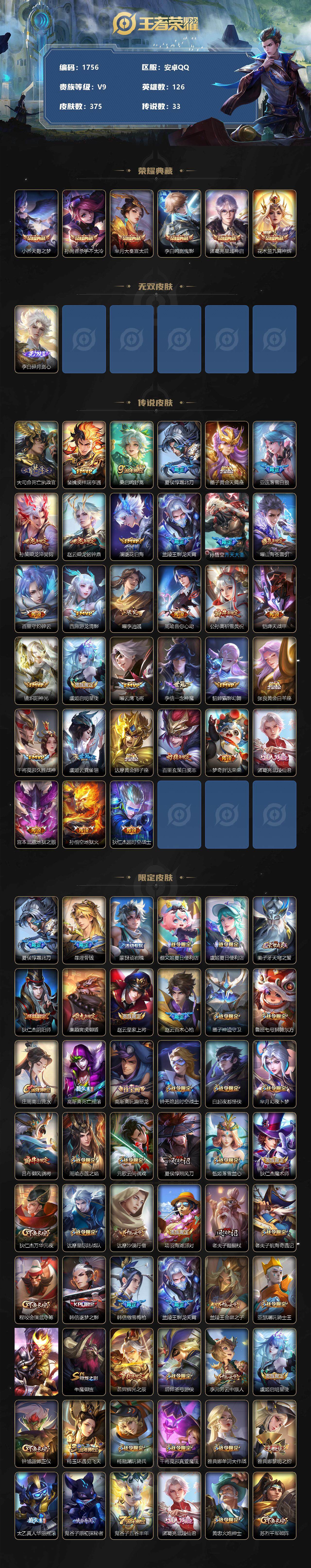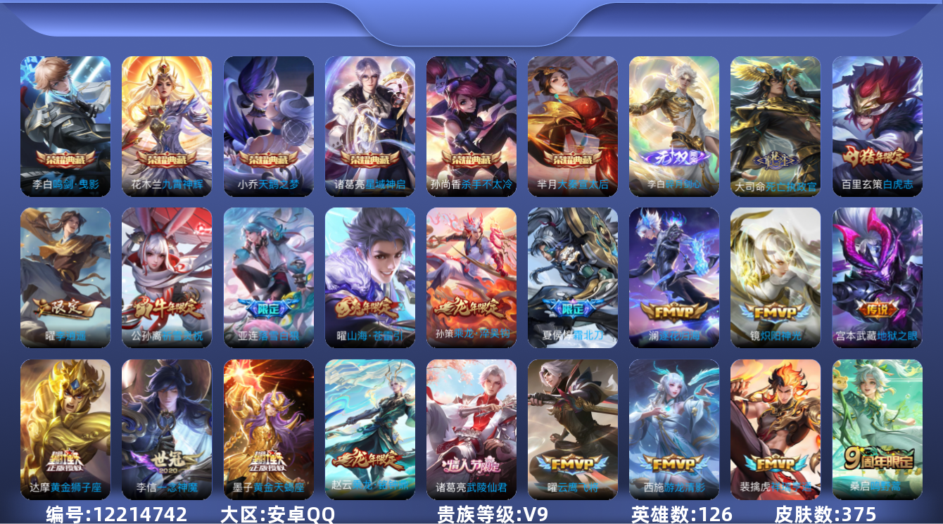 [12214742]【商品标题】:安卓Q-V9-至尊星耀III段位-126英雄-375皮肤-6典藏-0珍品无双-1无双-0珍品传说-33传说-109史诗