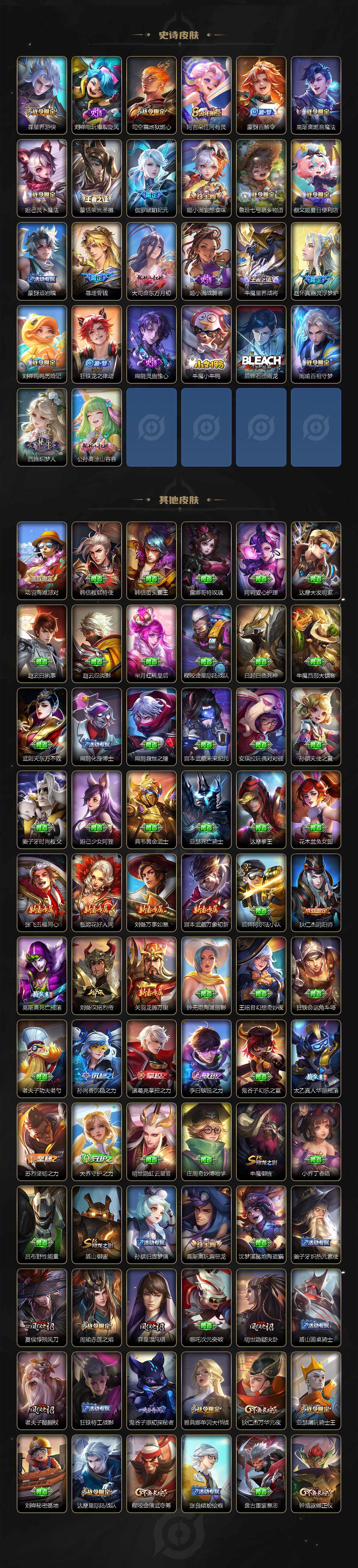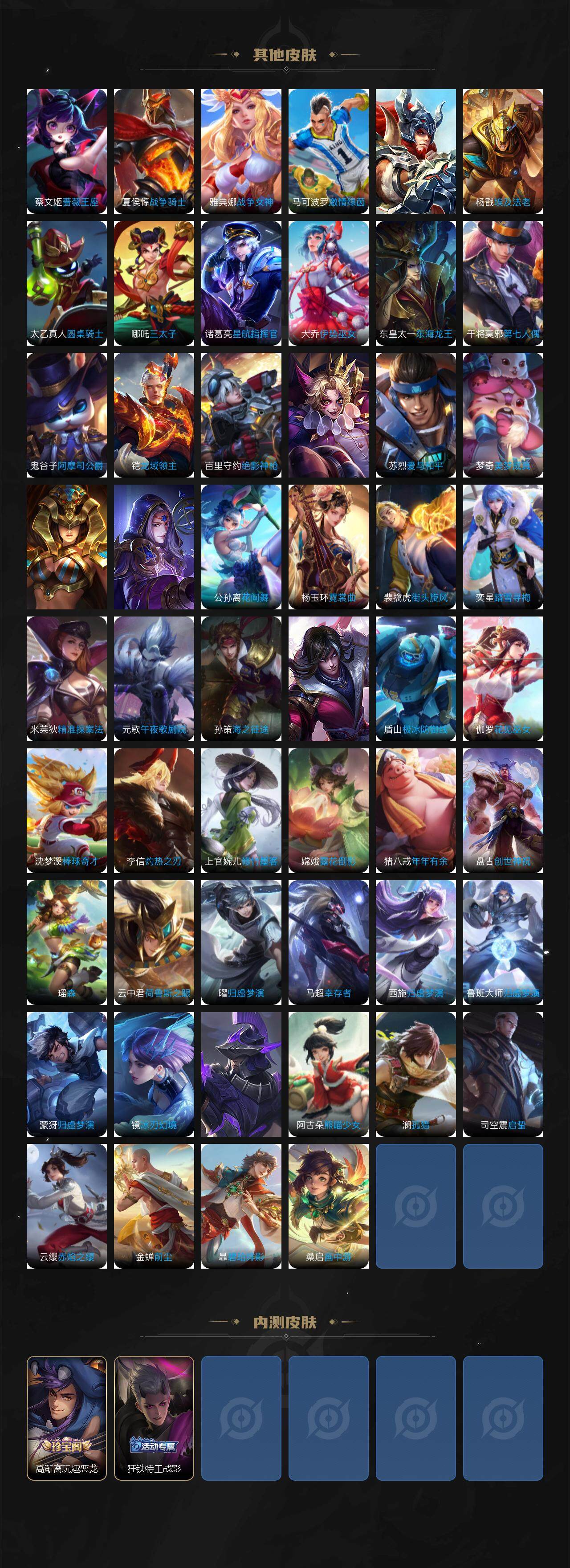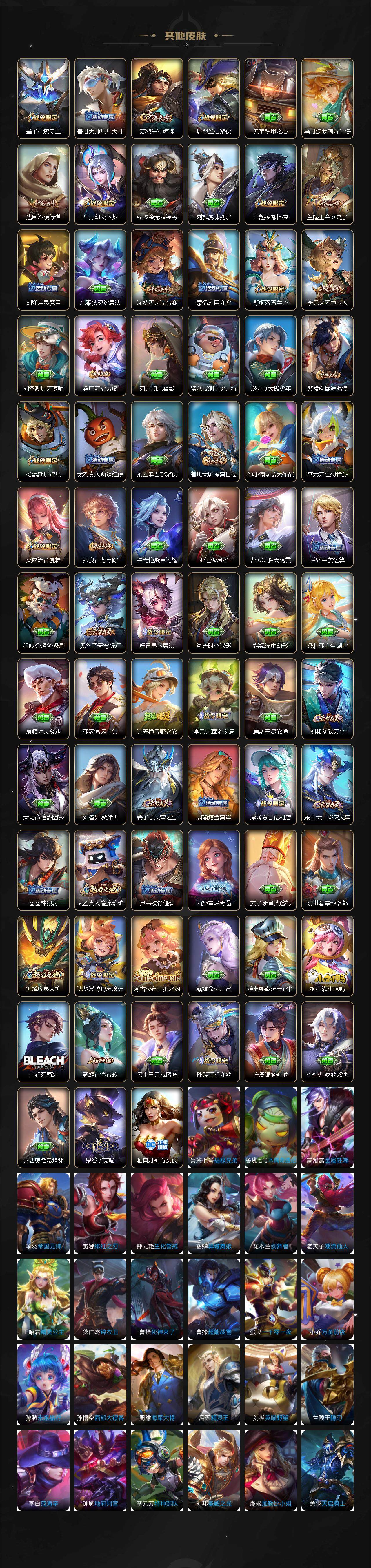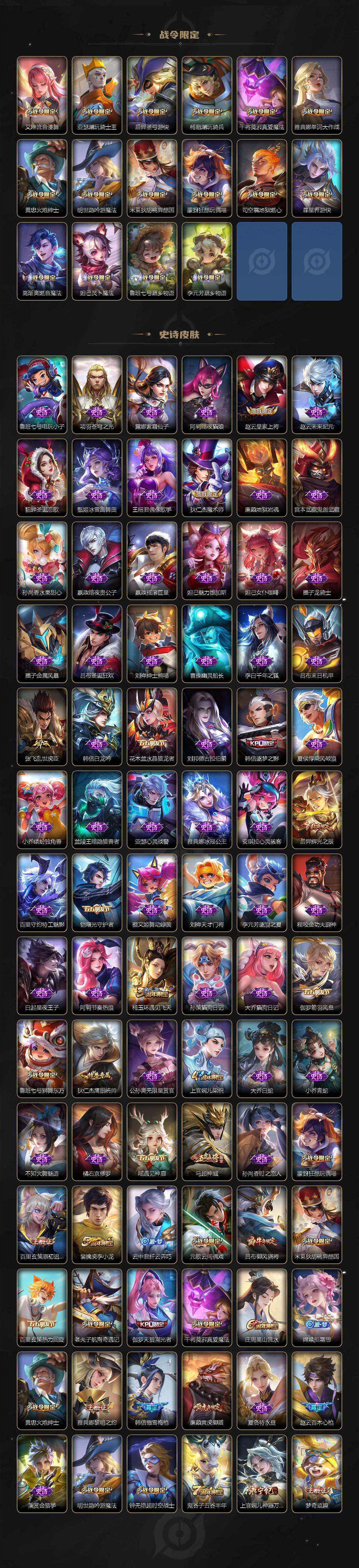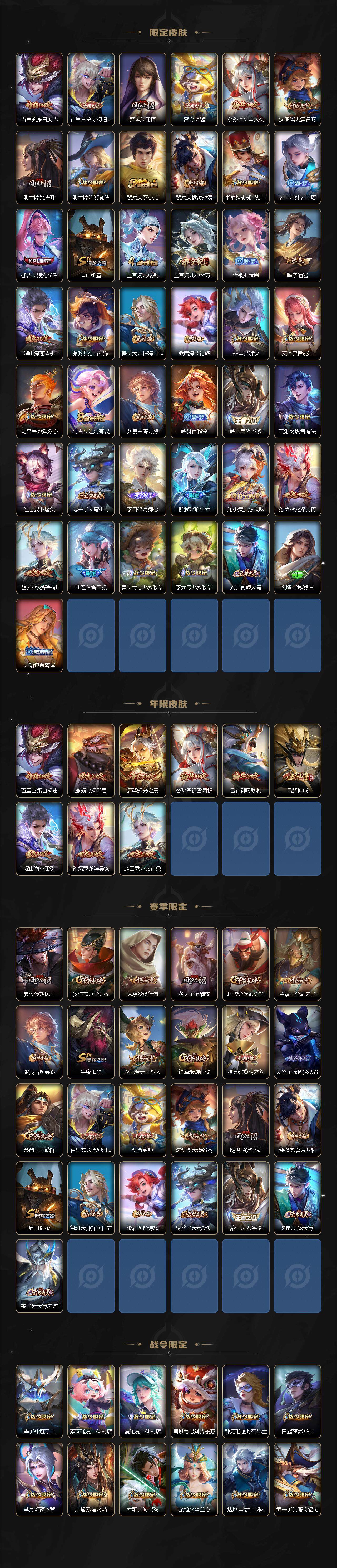 【限定皮肤】:夏侯惇霜北刀,暃埋骨钱,蒙犽顽岩魄,蔡文姬夏日便利店,虞姬夏日便利店,姜子牙天穹之誓,狄仁杰阴阳师,廉颇寅虎御盾,赵云皇家上将,赵云百木心枪,墨子神迹守卫,鲁班七号狮舞东方,庄周高山流水,高渐离死亡摇滚,高渐离玩趣恶龙,钟无艳超时空战士,白起夜都怪侠,芈月幻夜卜梦,吕布御风骁将,周瑜赤莲之焰,元歌云间偶戏,夏侯惇朔风刀,甄姬落雪兰心,狄仁杰魔术师,狄仁杰万华元夜,达摩星际陆战队,达摩沙漠行僧,项羽海滩派对,老夫子醍醐杖,老夫子航海奇遇记,程咬金演武夺筹,韩信逐梦之影,韩信傲雪梅枪,兰陵王影龙天霄,兰陵王金庭之子,亚瑟潮玩骑士王,孙悟空齐天大圣,牛魔御旌,后羿辉光之辰,后羿圣弓游侠,李元芳云中旅人,虞姬启明星使,钟馗驱傩正仪,杨玉环遇见飞天,杨戬潮玩骑兵,干将莫邪真爱魔法,雅典娜单词大作战,雅典娜黎明之约,太乙真人华丽摇滚,鬼谷子原初探秘者,鬼谷子五谷丰年,诸葛亮武陵仙君,黄忠火炮绅士,苏烈千军破阵,百里玄策白虎志,百里玄策原初追逐者,弈星混沌棋,梦奇顽趣,公孙离祈雪灵祝,沈梦溪大漠名商,明世隐疑决卦,明世隐吟游魔法,裴擒虎李小龙,裴擒虎擒涛扼浪,米莱狄胡桃异想国,云中君纤云弄巧,伽罗天狼溯光者,盾山御銮,上官婉儿梁祝,上官婉儿神器万象笔,嫦娥拒霜思,曜李逍遥 ,曜山海苍雷引,蒙犽狂想玩偶喵,鲁班大师探海日志,桑启海盐诗旅,暃星界游侠,艾琳流音漫舞,司空震地狱燃心,阿古朵江河有灵,张良古海寻踪,