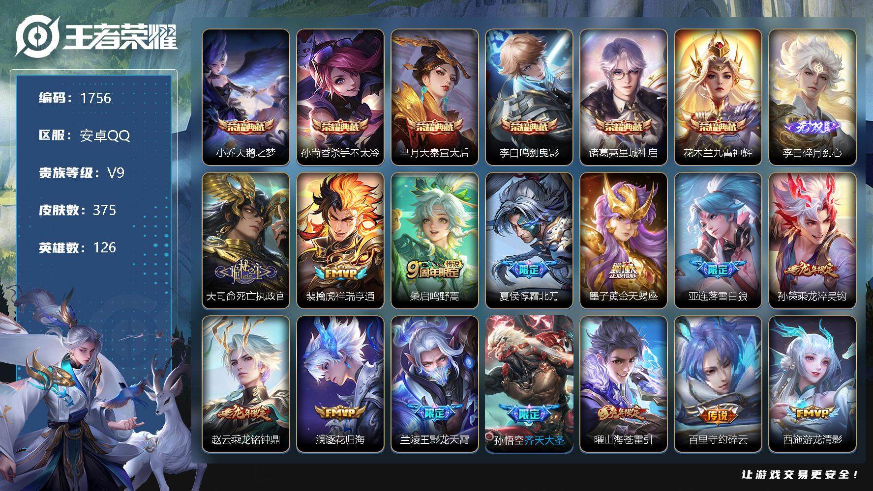 [12214742]【商品标题】:安卓Q-V9-至尊星耀III段位-126英雄-375皮肤-6典藏-0珍品无双-1无双-0珍品传说-33传说-109史诗 【荣耀典藏】:小乔天鹅之梦,孙尚香杀手不太冷,芈月大秦宣太后,李白鸣剑曳影,诸葛亮星域神启,花木兰九霄神辉 【无双皮肤】:李白碎月剑心 【传说皮肤】:大司命死亡执政官,裴擒虎祥瑞亨通,桑启鸣野蒿,夏侯惇霜北刀,墨子黄金天蝎座,亚连落雪白狼,孙策乘龙淬吴钩,赵云乘龙铭钟鼎,澜逐花归海,兰陵王影龙天霄,孙悟空齐天大圣,曜山海苍雷引,百里守约碎云,西施游龙清影,曜李逍遥 ,周瑜音你心动,公孙离祈雪灵祝,铠绛天战甲,镜炽阳神光,虞姬启明星使,曜云鹰飞将,李信一念神魔,貂蝉猫影幻舞,张良黄金白羊座,干将莫邪久胜战神,虞姬云霓雀翎,达摩黄金狮子座,百里玄策白虎志,梦奇胖达荣荣,诸葛亮武陵仙君,宫本武藏地狱之眼,孙悟空地狱火,狄仁杰超时空战士 【限定皮肤】:夏侯惇霜北刀,暃埋骨钱,蒙犽顽岩魄,蔡文姬夏日便利店,虞姬夏日便利店,姜子牙天穹之誓,狄仁杰阴阳师,廉颇寅虎御盾,赵云皇家上将,赵云百木心枪,墨子神迹守卫,鲁班七号狮舞东方,庄周高山流水,高渐离死亡摇滚,高渐离玩趣恶龙,钟无艳超时空战士,白起夜都怪侠,芈月幻夜卜梦,吕布御风骁将,周瑜赤莲之焰,元歌云间偶戏,夏侯惇朔风刀,甄姬落雪兰心,狄仁杰魔术师,狄仁杰万华元夜,达摩星际陆战队,达摩沙漠行僧,项羽海滩派对,老夫子醍醐杖,老夫子航海奇遇记,程咬金演武夺筹,韩信逐梦之影,韩信傲雪梅枪,兰陵王影龙天霄,兰陵王金庭之子,亚瑟潮玩骑士王,孙悟空齐天大圣,牛魔御旌,后羿辉光之辰,后羿圣弓游侠,李元芳云中旅人,虞姬启明星使,钟馗驱傩正仪,杨玉环遇见飞天,杨戬潮玩骑兵,干将莫邪真爱魔法,雅典娜单词大作战,雅典娜黎明之约,太乙真人华丽摇滚,鬼谷子原初探秘者,鬼谷子五谷丰年,诸葛亮武陵仙君,黄忠火炮绅士,苏烈千军破阵,百里玄策白虎志,百里玄策原初追逐者,弈星混沌棋,梦奇顽趣,公孙离祈雪灵祝,沈梦溪大漠名商,明世隐疑决卦,明世隐吟游魔法,裴擒虎李小龙,裴擒虎擒涛扼浪,米莱狄胡桃异想国,云中君纤云弄巧,伽罗天狼溯光者,盾山御銮,上官婉儿梁祝,上官婉儿神器万象笔,嫦娥拒霜思,曜李逍遥 ,曜山海苍雷引,蒙犽狂想玩偶喵,鲁班大师探海日志,桑启海盐诗旅,暃星界游侠,艾琳流音漫舞,司空震地狱燃心,阿古朵江河有灵,张良古海寻踪,
