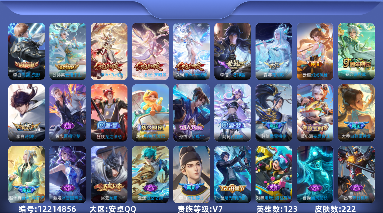 - [10533656]V10 5典藏 2无双 3珍品传说 72传说 125英雄 539皮肤 可修改实名 荣耀水晶:最初的交响(伽罗典藏),幻阙歌(貂蝉典藏),全息碎影(猴子典藏),星域神启(倪克斯贼亮),大秦宣太后 无双皮:离恨烟(公孙离无双),小乔时之魔女(小乔无双) 珍品传说:兔狲·蓬尾,酷洛米之心,大耳狗之梦 传说皮:牧神诗旅,金乌负日,琥珀纪元铠,琥珀纪元马超,乘龙·问璇玑(孙尚香年限),乘龙·铭钟鼎(赵云年限),乘龙·淬吴钩(孙策年限),典韦战鼓燎原,落雪白狼,幻光神枪,铠冥王哈迪斯,朵莉亚心动手记,遇见胡旋,游龙清影(小青龙),永恒水手月亮,山海·炽霜斩(李信年限),山海·琳琅生(小乔年限),大乔-时之奇旅,黄金狮子座,黄金白羊座,仲夏夜之梦(大飞蛾),地狱之眼,末日机甲-孙尚香(绿蚂蚱),云霓雀翎,一念神魔,淬星耀世,久胜战神,云鹰飞将(小将军),炽阳神光,无双飞将,音你心动-周瑜,乞巧织情,时之恋人-刘备(电焊工),飞鸢探春,超时空战士-狄仁杰,花朝如约(花篮子),音你闪耀(rap皮),碎云,山海·苍雷引(电光曜子),浮生妄,记忆之芯(机甲兔),妄想实况,妄想奇谈,鲁班七号-时之奇旅,夜礼服假面,小动物乐团,霜月吟,澜逐花归海,艾琳觅芳踪 珍宝阁皮:妄想食味,胡桃夹子,蔷薇恋人 限定皮:愿照·九州拓(澜年限),愿照·福禄聚(蔡文姬年限),愿照·岁时盈(虞姬年限),愿照·山河定(司空震年限),愿照·众生和(妲己年限),愿照·千秋盛(女娲年限),逐霄战戟,映山客,鸣野蒿,夏侯惇霜北刀,至尊宝,太华(伽罗年限),傲雪梅枪,补天,寅虎·展翼(孙膑年限),前尘镜,绯月行,时之彼端,魔法小厨娘,白晶晶,时雨天司(水龙头),山海·碧波行(瑶年限),瑞麟志(木兰年限),至美·乘鲤谣,至美·化雀舞,遇见飞天,高山流水,诗剑行,怒海麟威,五谷丰年,冰锋战神,天狼运算者,游园惊梦,梁祝,御风骁将(吕布年限),龙胆,逐梦之星,岱宗(典韦年限),天狼溯光者,逐梦之音,奔雷神使(牛魔年限),祈雪灵祝(雪兔子),天狼绘梦者,李小龙,朱雀志(守约年限),如梦令-嫦娥,霸王别姬-项羽,霸王别姬-虞姬,默契交锋-花木兰,孙行者,猪悟能,蜜橘之夏,热情桑巴,寅虎·心曲(虎婆),寅虎·赤拳(老虎年限),玉兔公主,启示之音,无尽星芒,深海之息(深海大菠萝),唐三藏,梦圆繁星,山海·玄木吟(马可年限) 史诗皮:星界