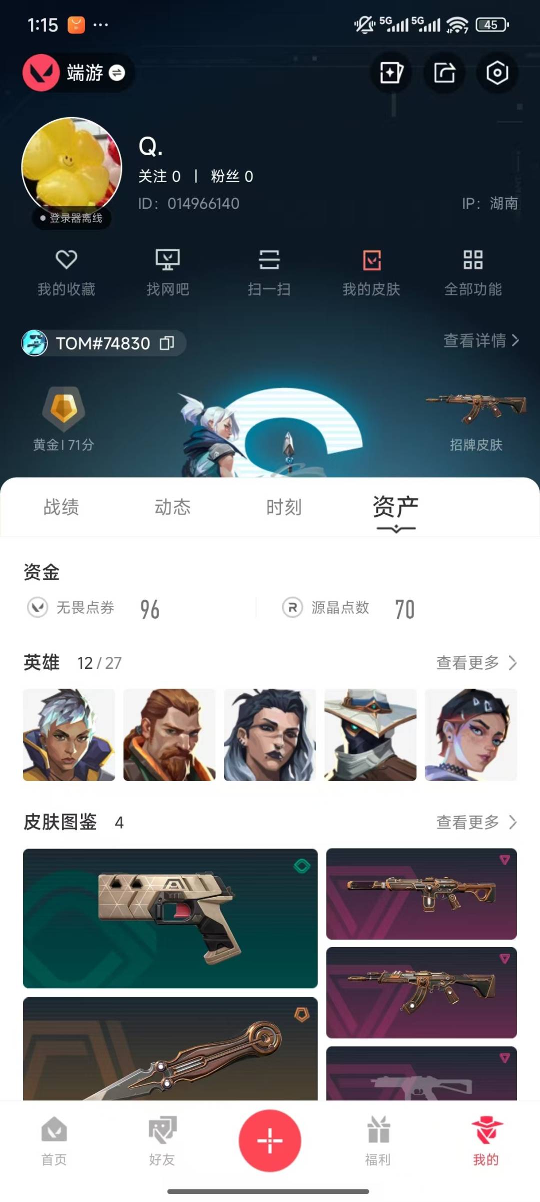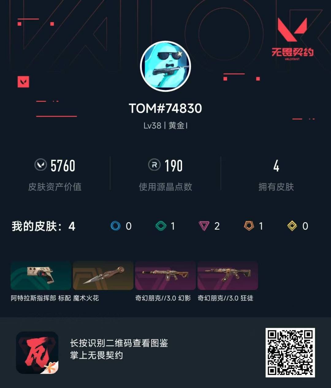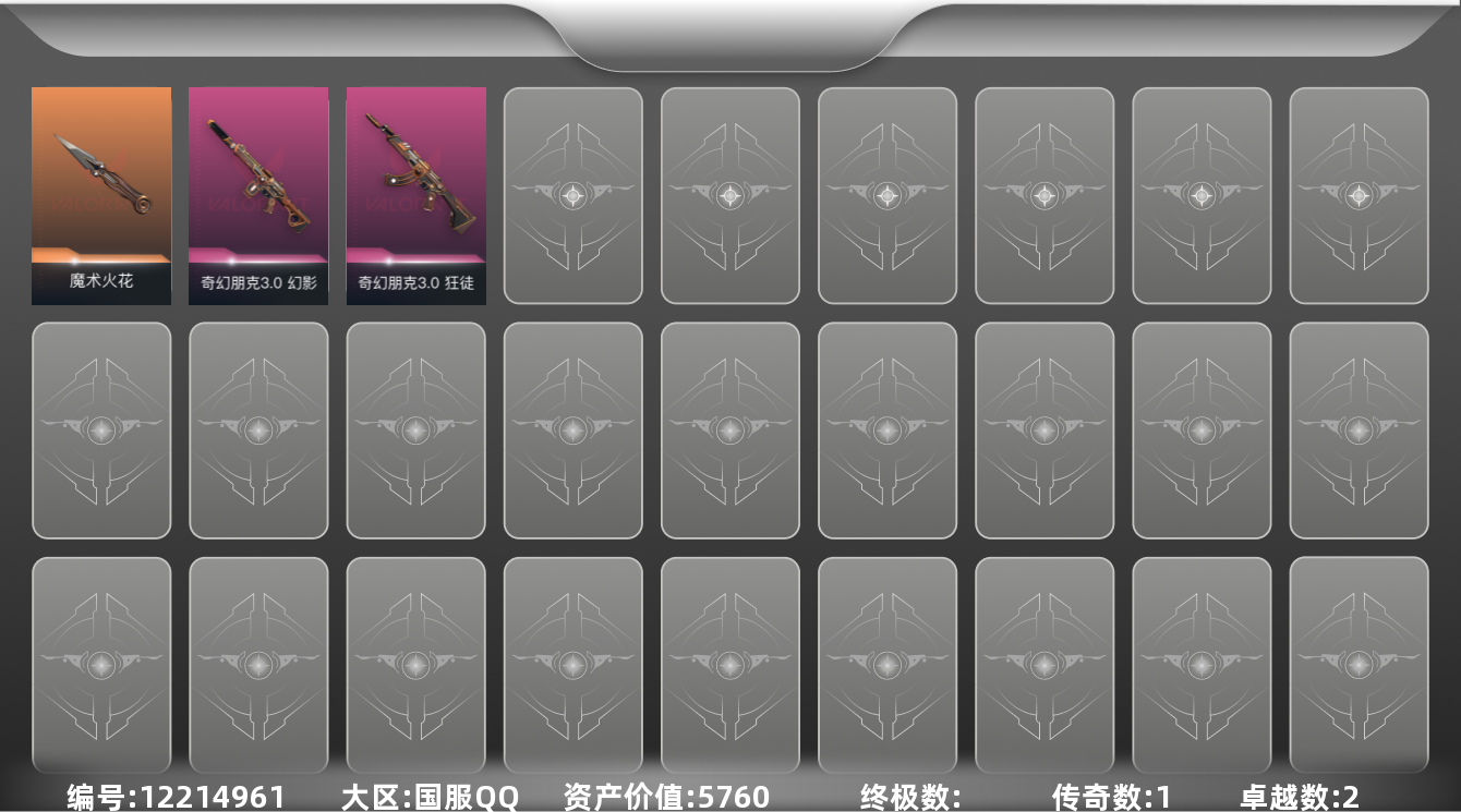 [12214961]1橙皮 2紫皮 4皮肤 12英雄 27卡面 190已用源晶 黄金 优质装备:魔术火花 步枪皮肤:奇幻朋克3.0狂徒,幻影-奇幻朋克3.0