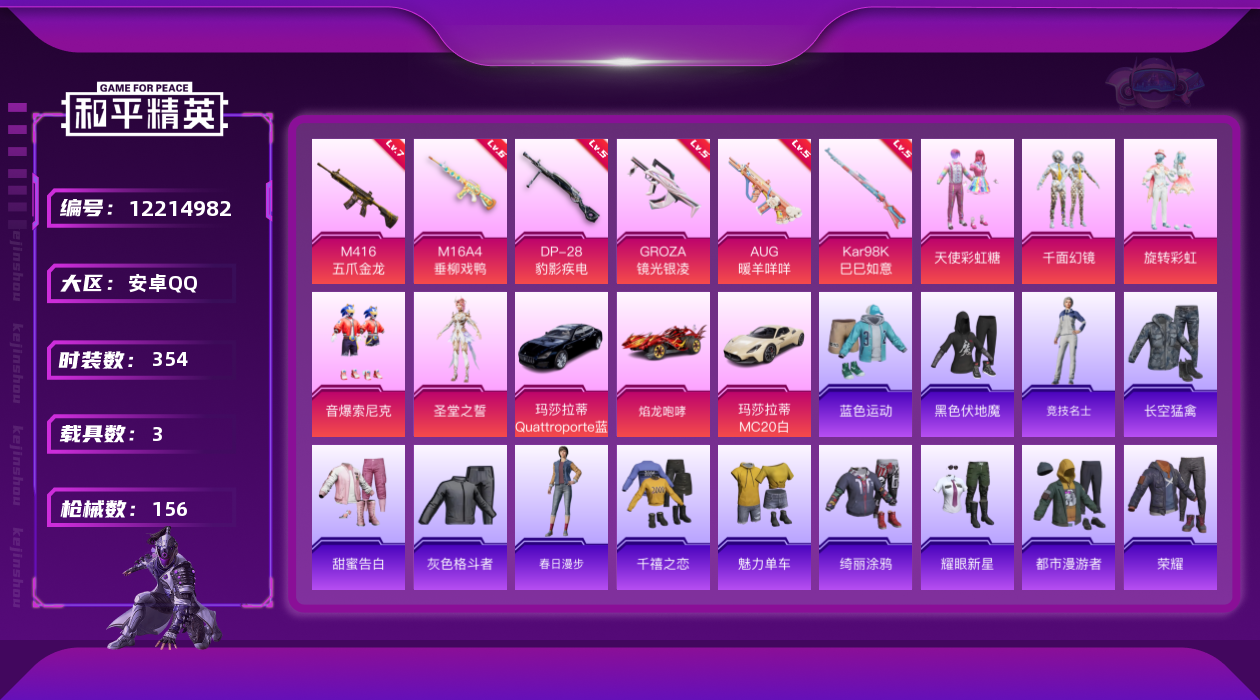 - PX_2081214- 安卓手Q-22王牌印记-21粉装-15特效枪-3载具-144199热力值-305套装-410枪皮-3卓越印记-1传奇印记 【21粉装】,雪国幻梦,梦幻火箭,天使彩虹糖,放客神游,幻彩电音,冷漠罗丽,恐龙拽拽,花间之火,极致幻想,暗夜玫瑰,深海曼妙,炫光之旅,水仙星,冰霜白皇,炙焰红王,锦绣火鲤,绚金战神,音爆索尼克,挚爱序曲,星之彼岸,烟云彩露 【15特效枪】AKM-炫紫旋