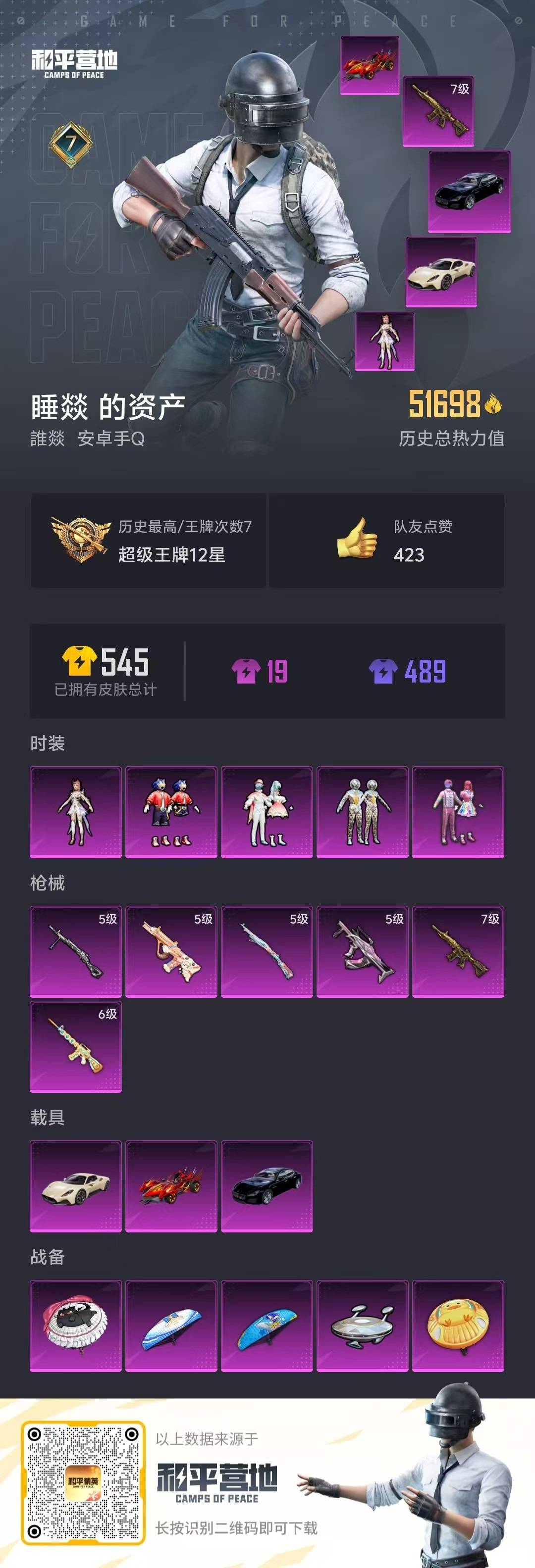 - PX_2095424-安卓QQ 历史总热力值:64375 粉装数量:15 特效枪数量:11 载具数量:1 王牌印记:8 历史最高段位:超级王牌15星 套装数量:121 时装数量:435 枪械数量:178 战备数量:159 装备数量:295 载具:双人摩托-梦幻火箭 时装:套装-冰川幽秘,套装-冰川粉黛,套装-宝贝奶油派,套装-寒光使者,套装-岚岚物语,套装-星穹咏叹调,套装-炙焰红王,套装-缤纷油