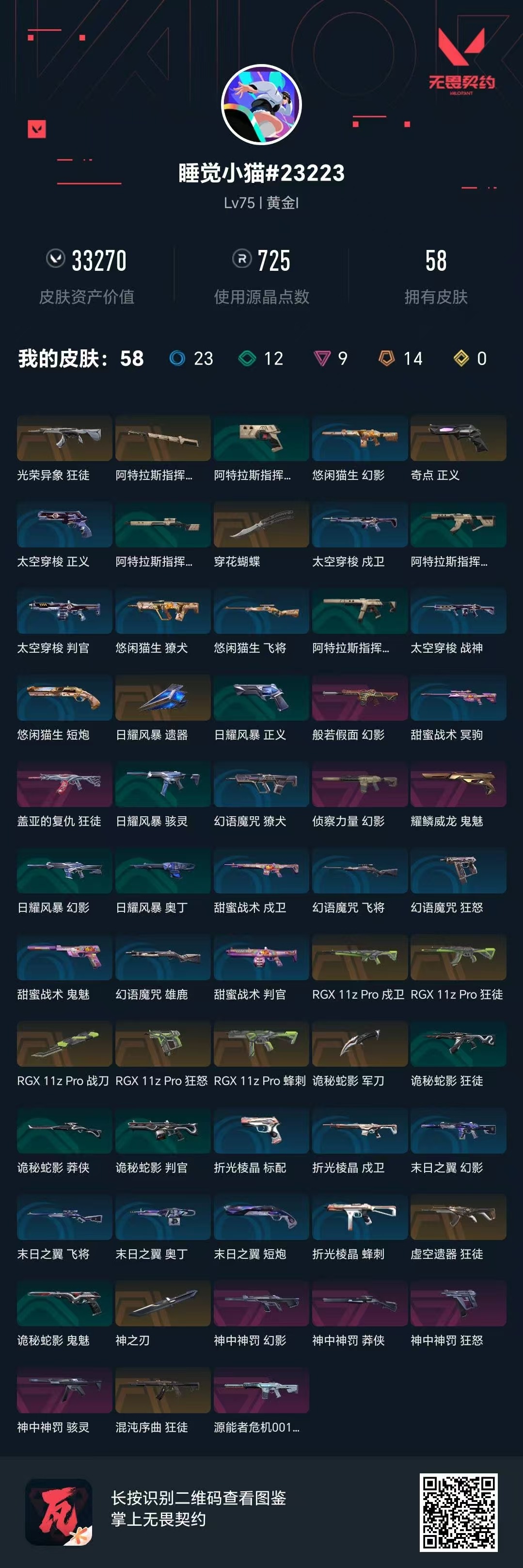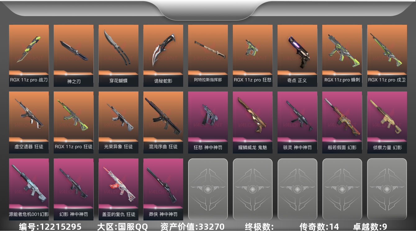 [12215295]14橙皮 9紫皮 58皮肤 18英雄 90卡面 725已用源晶 黄金 优质装备:正义-奇点,狂徒-混沌序曲,狂徒-盖亚的复仇,幻影-侦察力量,幻影-般若假面,幻影-源能者危机001,穿花蝴蝶,诡秘蛇影,神之刃,RGX 11z pro 战刀,阿特拉斯指挥部,鬼魅-耀鳞威龙 套装:神罚套装,RGX 11z pro套装,神中神罚套装 佩枪皮肤:狂怒-神中神罚,RGX 11z pro 狂怒 冲锋枪皮肤:RGX 11z pro 蜂刺,骇灵-神中神罚 步枪皮肤:狂徒-虚空遗器,幻影-神中神罚,狂徒-光荣异象,RGX 11z pro 狂徒,RGX 11z pro 戍卫 狙击枪皮肤:莽侠-神中神罚