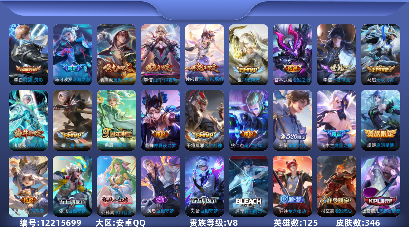 [12215699]【商品标题】:安卓Q-V8-最强王者段位-125英雄-346皮肤-1典藏-0珍品无双-0无双-0珍品传说-19传说-100史诗