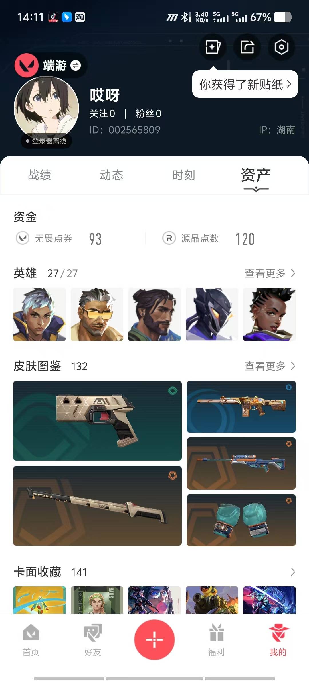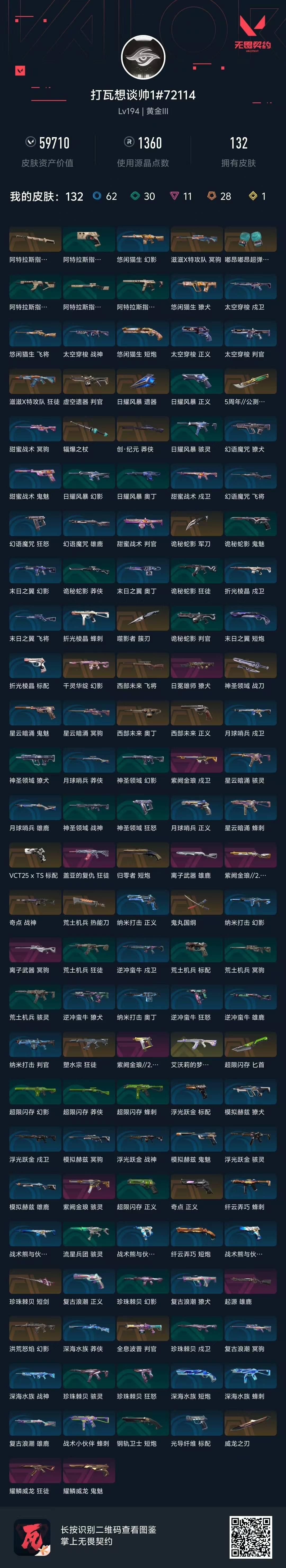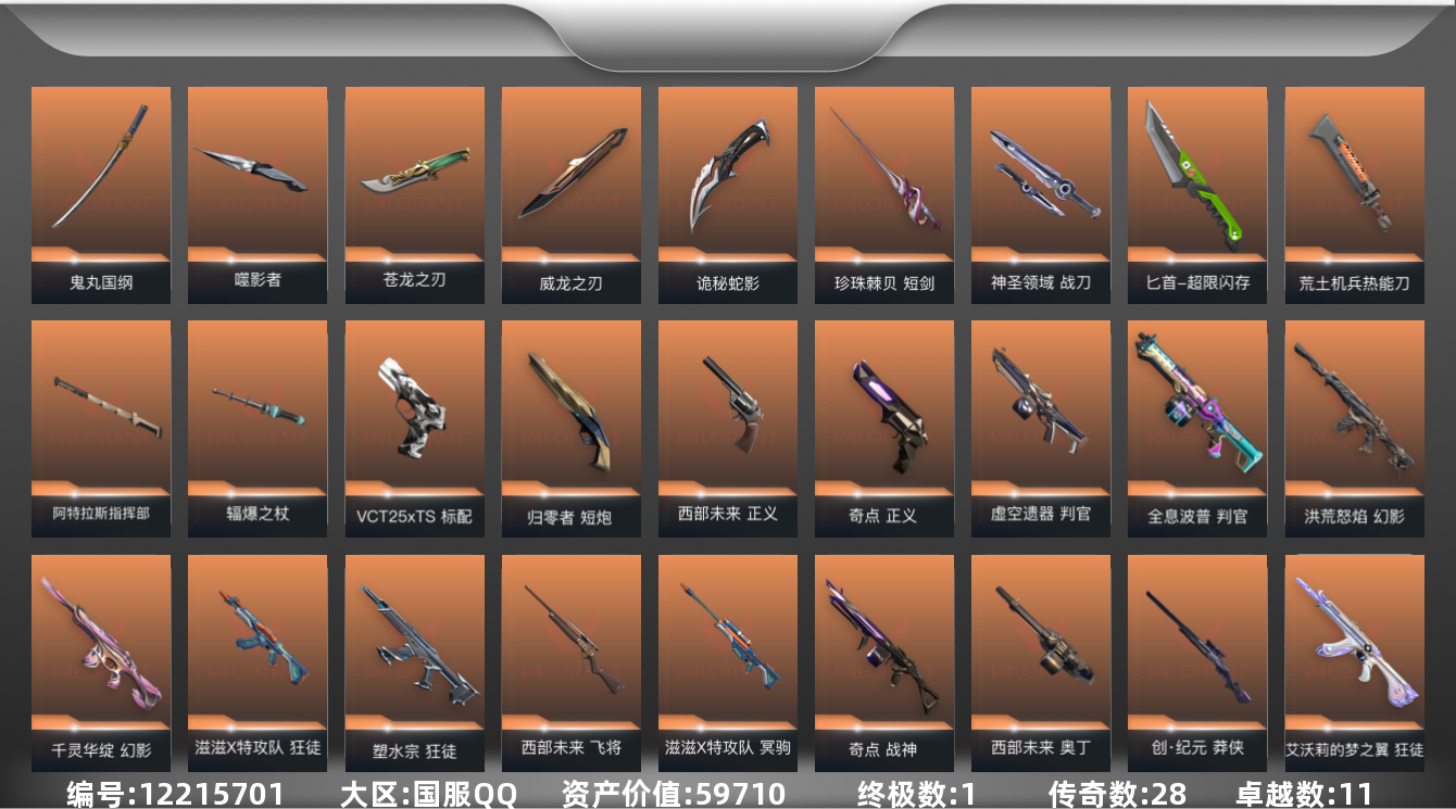 [12215701]28橙皮 1金皮 11紫皮 132皮肤 27英雄 141卡面 1360已用源晶 黄金 优质装备:耀鳞威龙套装,正义-奇点,狂徒-塑水宗,幻影-千灵华绽,狂徒-艾沃莉的梦之翼,狂徒-盖亚的复仇,幻影-洪荒怒焰,冥驹-离子武器,判官-全息波普,狂徒-耀鳞威龙,威龙之刃,匕首-超限闪存,荒土机兵热能刀,鬼丸国纲,神圣领域 战刀,噬影者簇刃,诡秘蛇影,辐爆之杖,苍龙之刃,阿特拉斯指挥部,雄鹿-起源,骇灵-紫阙金琅,戍卫-紫阙金琅,雄鹿-紫阙金琅2.0,雄鹿-离子武器,獠犬-日冕雄师,鬼魅-耀鳞威龙 套装:滋滋X特工队 佩枪皮肤:正义-西部未来,标配-VCT25xTS,狂怒-紫阙金琅2.0,短炮-归零者 霰弹枪皮肤:判官-虚空遗器 步枪皮肤:狂徒-滋滋X特攻队 狙击枪皮肤:莽侠-创·纪元,飞将-西部未来,冥驹-滋滋X特攻队 机枪皮肤:战神-奇点,奥丁-西部未来 近战武器皮肤:短剑-珍珠棘贝