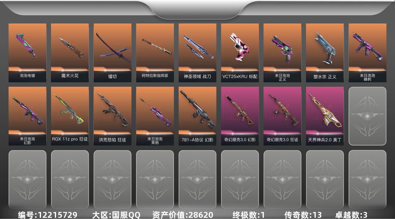 [12215729]13橙皮 1金皮 3紫皮 53皮肤 27英雄 81卡面 715已用源晶 钻石 优质装备:幻影-781-A协议,正义-塑水宗,狂徒-洪荒怒焰,奥丁-天界神兵2.0,镭切,神圣领域 战刀,阿特拉斯指挥部,魔术火花,泡泡电锯,幻影-末日泡泡,冥驹-末日泡泡,正义-末日泡泡,蜂刺-末日泡泡 佩枪皮肤:标配-VCT25xKRU 步枪皮肤:奇幻朋克3.0狂徒,幻影-奇幻朋克3.0,RGX 11z pro 狂徒