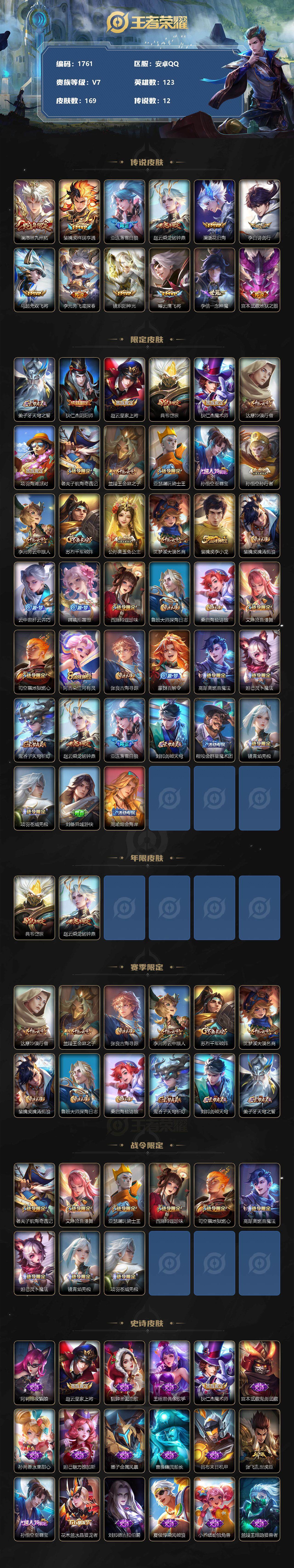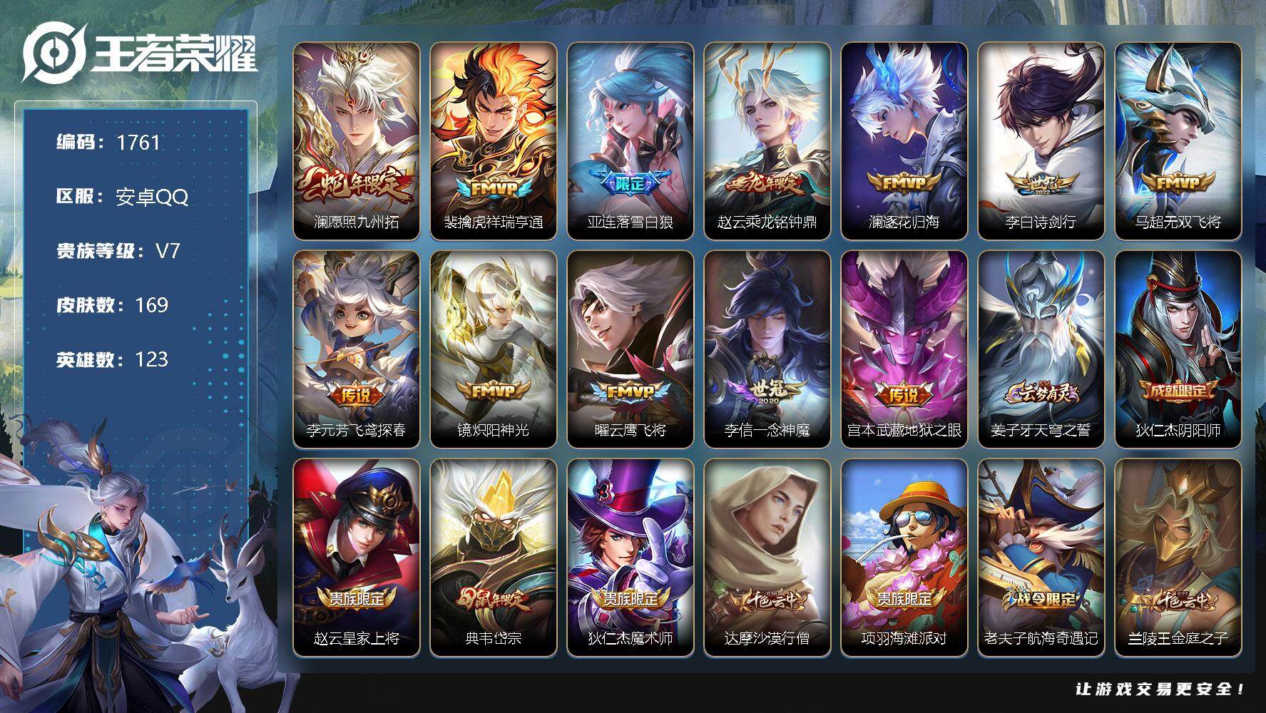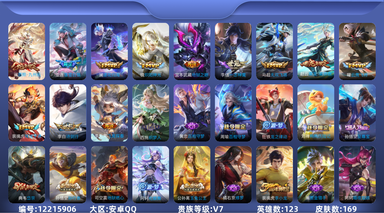[12215906]【商品标题】:安卓Q-V7-最强王者段位-123英雄-169皮肤-0典藏-0珍品无双-0无双-0珍品传说-12传说-43史诗