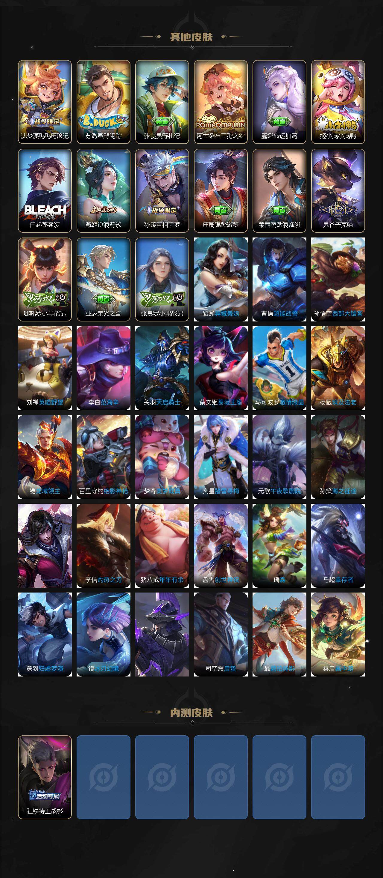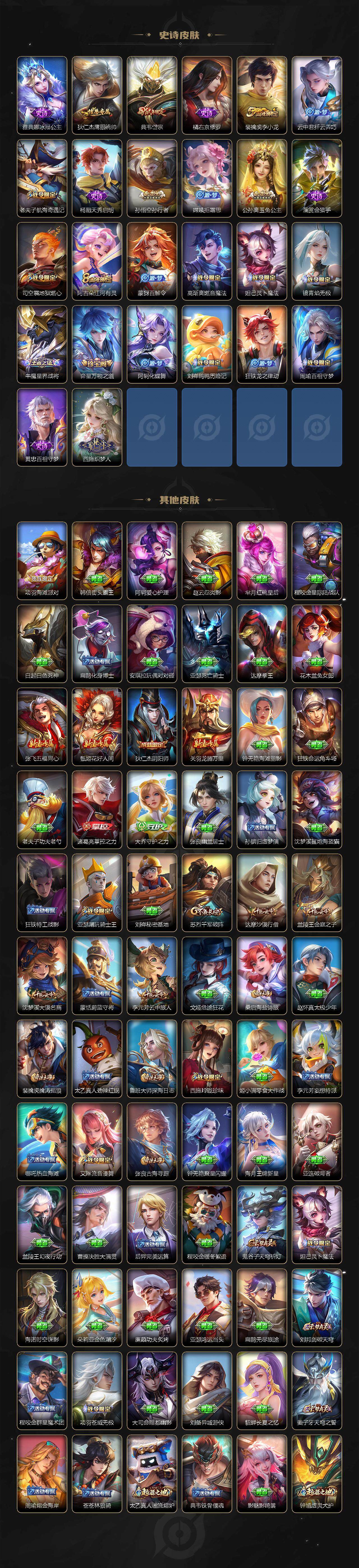 【史诗皮肤】:阿轲暗夜猫娘,赵云皇家上将,貂蝉圣诞恋歌,王昭君偶像歌手,狄仁杰魔术师,宫本武藏鬼剑武藏,孙尚香水果甜心,妲己魅力维加斯,墨子金属风暴,曹操幽灵船长,吕布末日机甲,张飞乱世虎臣,孙悟空至尊宝,花木兰水晶猎龙者,刘邦德古拉伯爵,夏侯惇乘风破浪,小乔缤纷独角兽,兰陵王暗隐猎兽者,雅典娜冰冠公主,狄仁杰鹰眼统帅,典韦岱宗,橘右京修罗,裴擒虎李小龙,云中君纤云弄巧,老夫子航海奇遇记,杨戬天秀启明,孙悟空孙行者,嫦娥拒霜思,公孙离玉兔公主,澜赏金猎手,司空震地狱燃心,阿古朵江河有灵,蒙犽百解令,妲己灵卜魔法,高渐离燃音魔法,镜青焰无极,牛魔星界战将,弈星万物之道,阿轲化蝶舞,刘禅鸭鸭历险记,狂铁龙之律动,周瑜百相守梦,黄忠百相守梦,西施织梦人