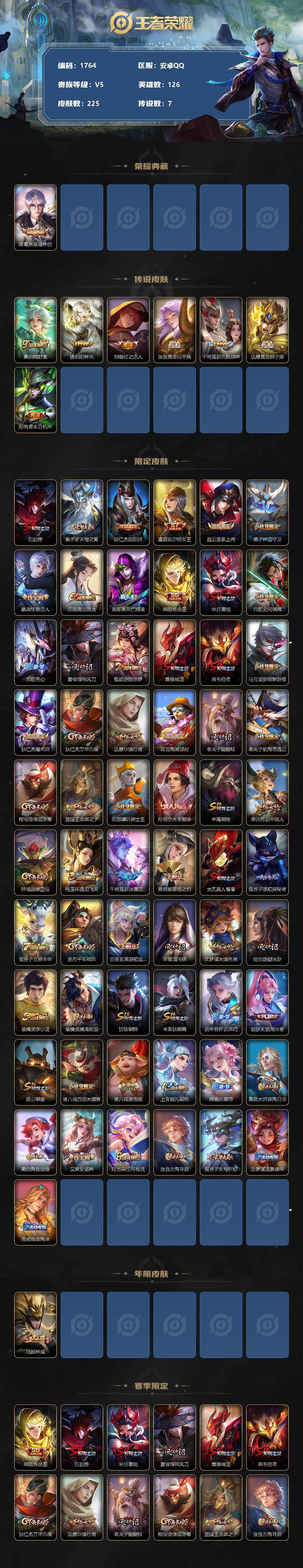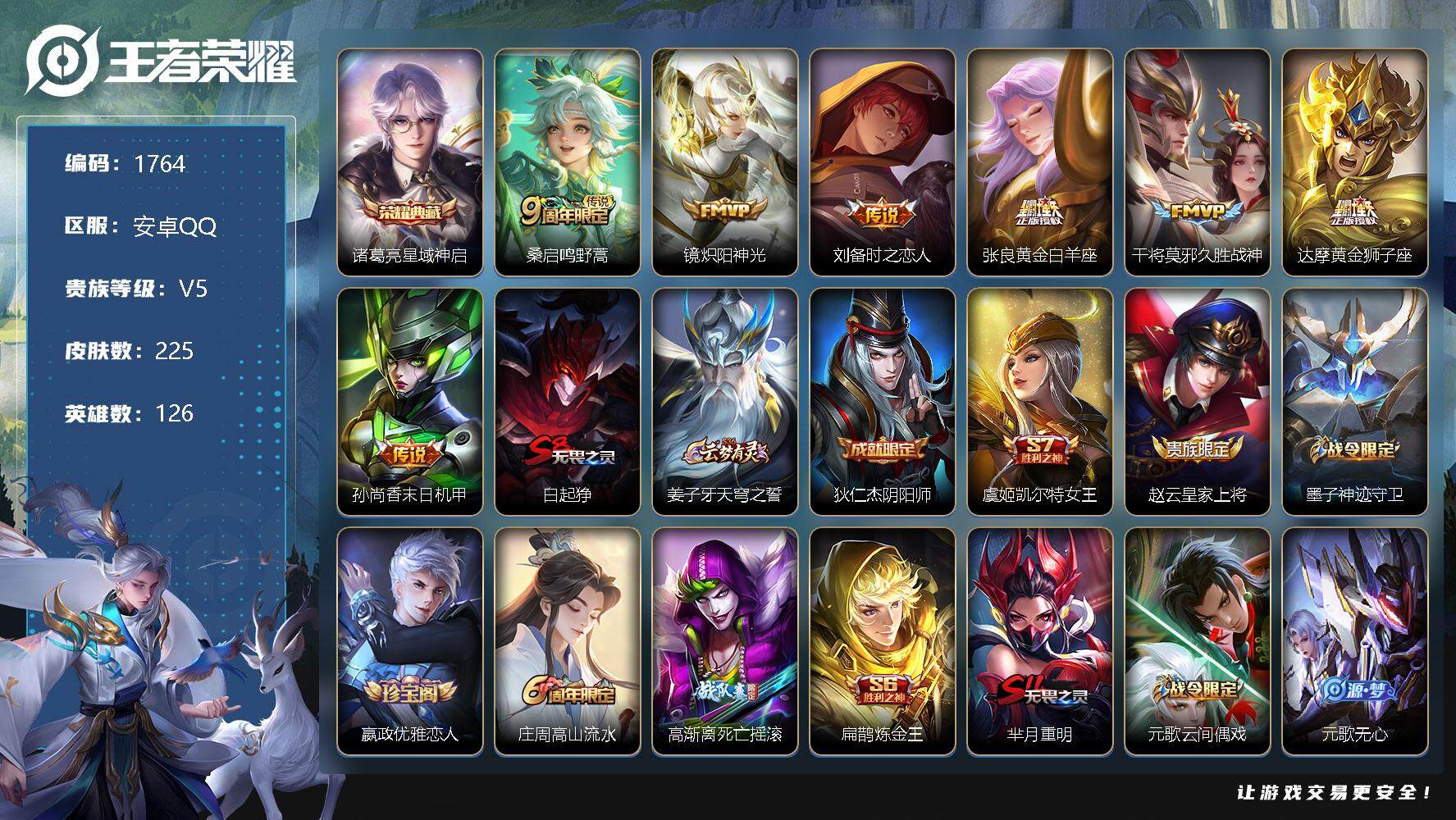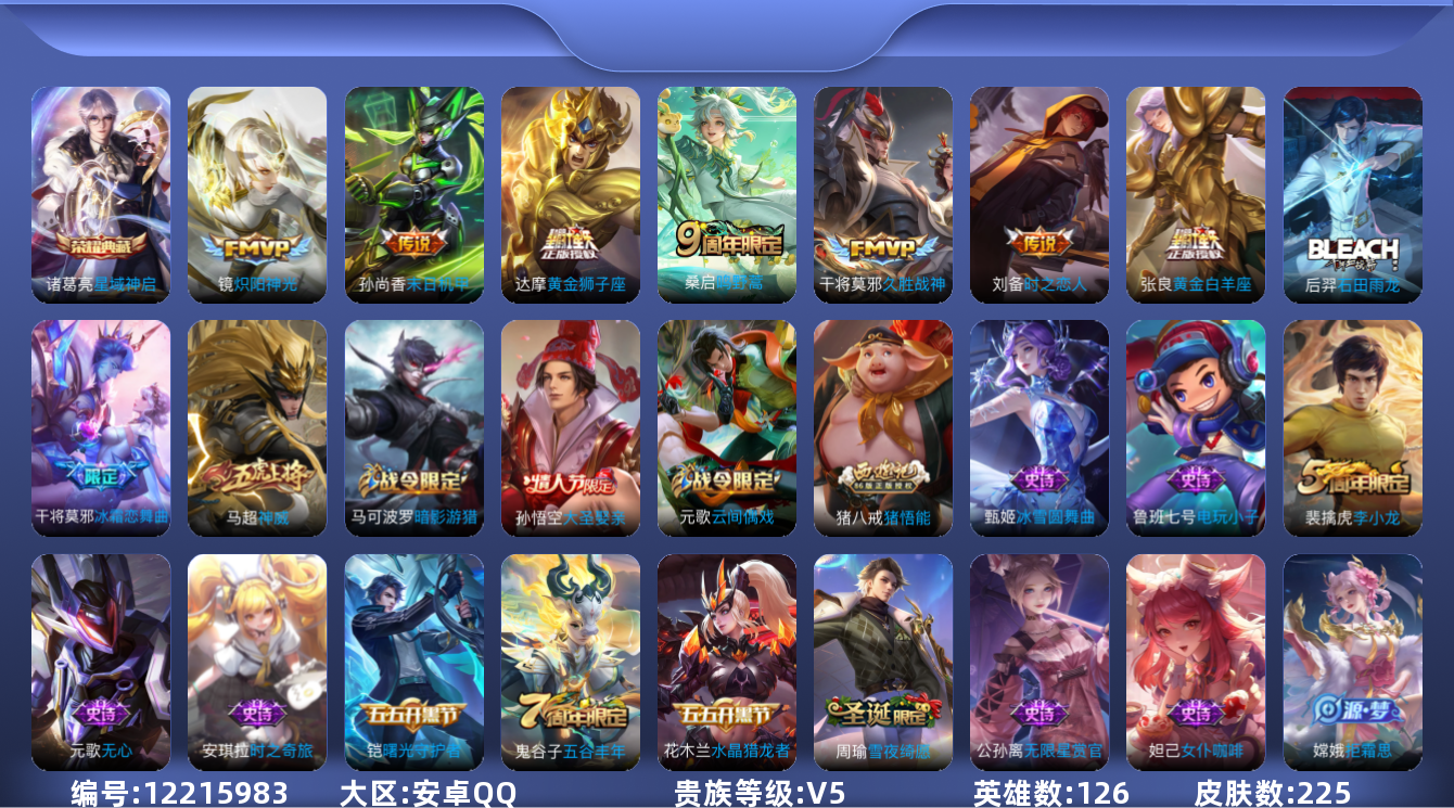 [12215983]【商品标题】:安卓Q-V5-至尊星耀IV段位-126英雄-225皮肤-1典藏-0珍品无双-0无双-0珍品传说-7传说-70史诗