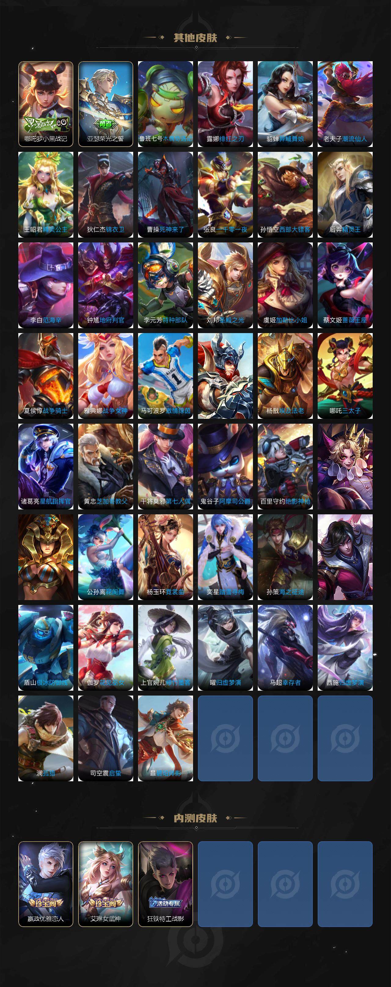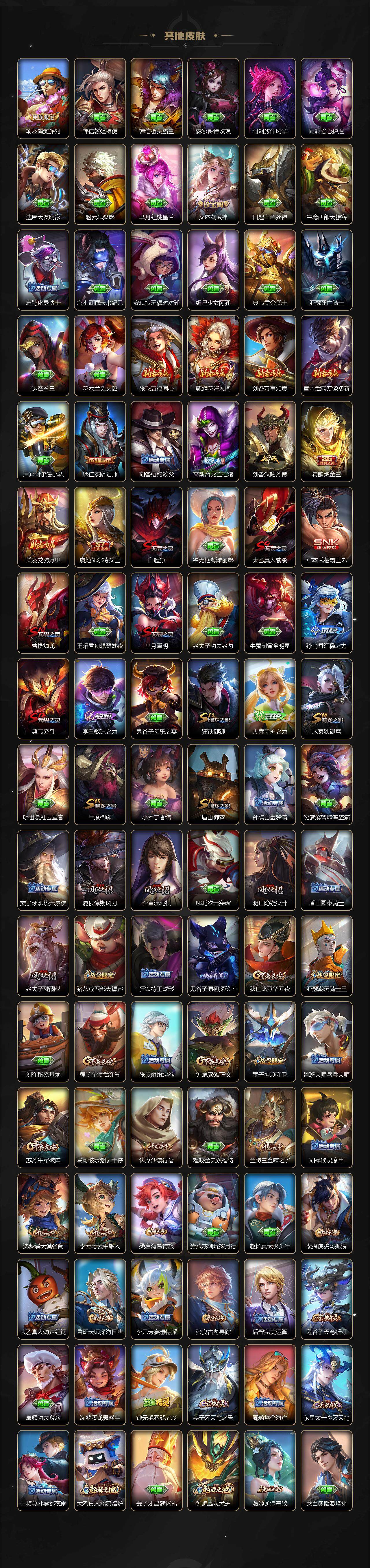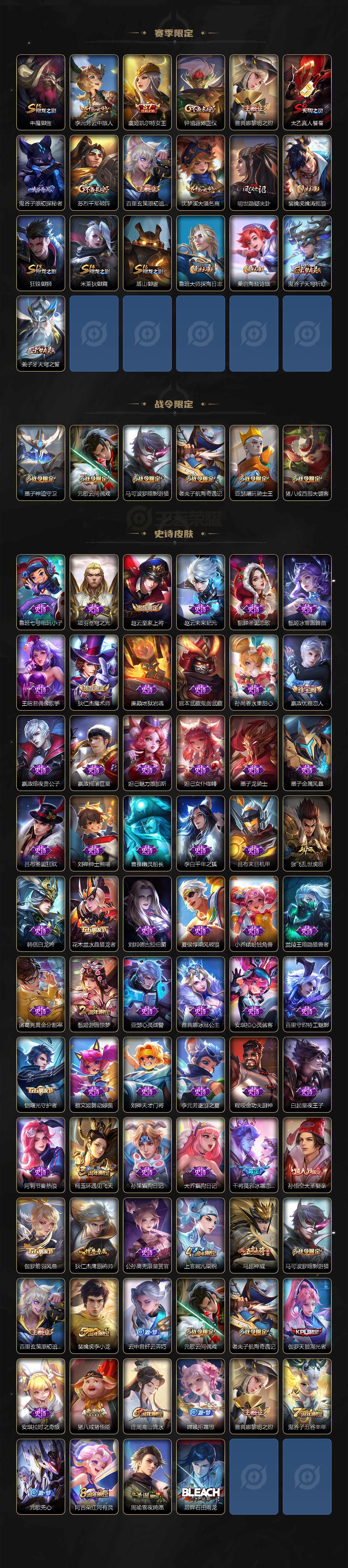 【限定皮肤】:白起狰,姜子牙天穹之誓,狄仁杰阴阳师,虞姬凯尔特女王,赵云皇家上将,墨子神迹守卫,嬴政优雅恋人,庄周高山流水,高渐离死亡摇滚,扁鹊炼金王,芈月重明,元歌云间偶戏,元歌无心,夏侯惇朔风刀,甄姬游园惊梦,曹操烛龙,典韦穷奇,马可波罗暗影游猎,狄仁杰魔术师,狄仁杰万华元夜,达摩沙漠行僧,项羽海滩派对,老夫子醍醐杖,老夫子航海奇遇记,程咬金演武夺筹,兰陵王金庭之子,亚瑟潮玩骑士王,孙悟空大圣娶亲,牛魔御旌,李元芳云中旅人,钟馗驱傩正仪,杨玉环遇见飞天,干将莫邪冰霜恋舞曲,雅典娜黎明之约,太乙真人饕餮,鬼谷子原初探秘者,鬼谷子五谷丰年,苏烈千军破阵,百里玄策原初追逐者,弈星混沌棋,沈梦溪大漠名商,明世隐疑决卦,裴擒虎李小龙,裴擒虎擒涛扼浪,狂铁御狮,米莱狄御霄,云中君纤云弄巧,伽罗天狼溯光者,盾山御銮,猪八戒西部大镖客,猪八戒猪悟能,上官婉儿梁祝,嫦娥拒霜思,鲁班大师探海日志,桑启海盐诗旅,艾琳女武神,阿古朵江河有灵,张良古海寻踪,鬼谷子天穹祈灯,沈梦溪龙舞盛年,周瑜熔金海岸