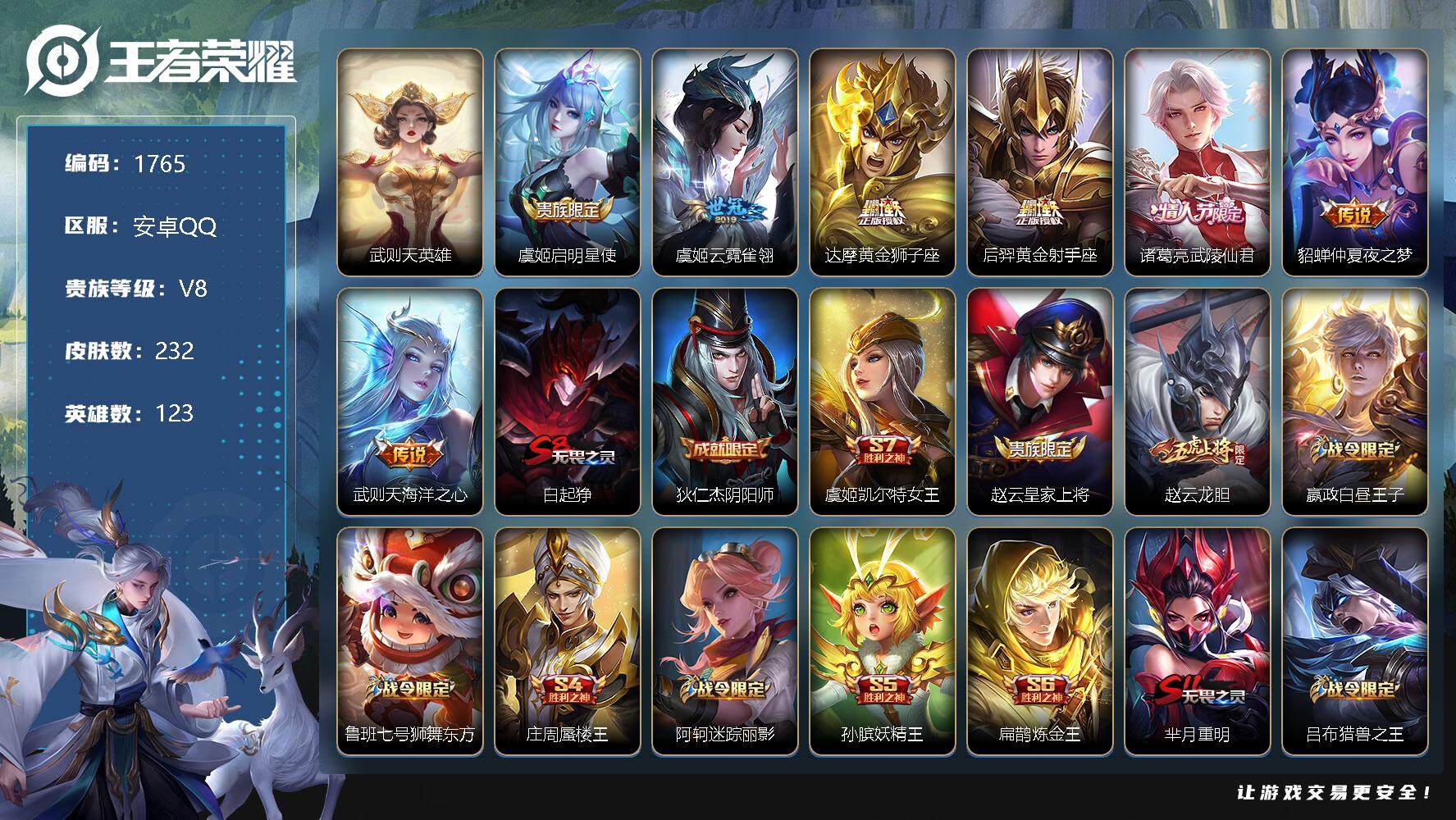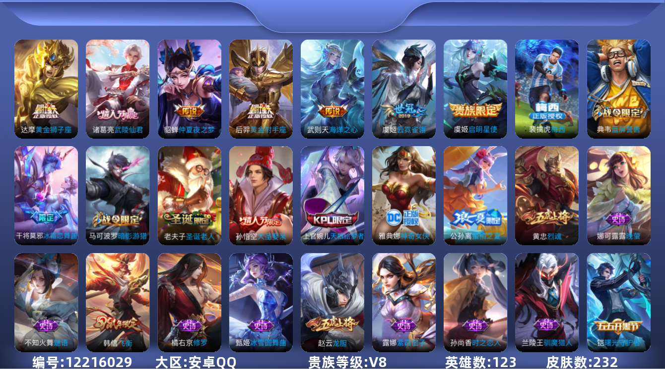 [12216029]【商品标题】:安卓Q-V5-永恒钻石II段位-123英雄-232皮肤-0典藏-0珍品无双-0无双-0珍品传说-7传说-55史诗