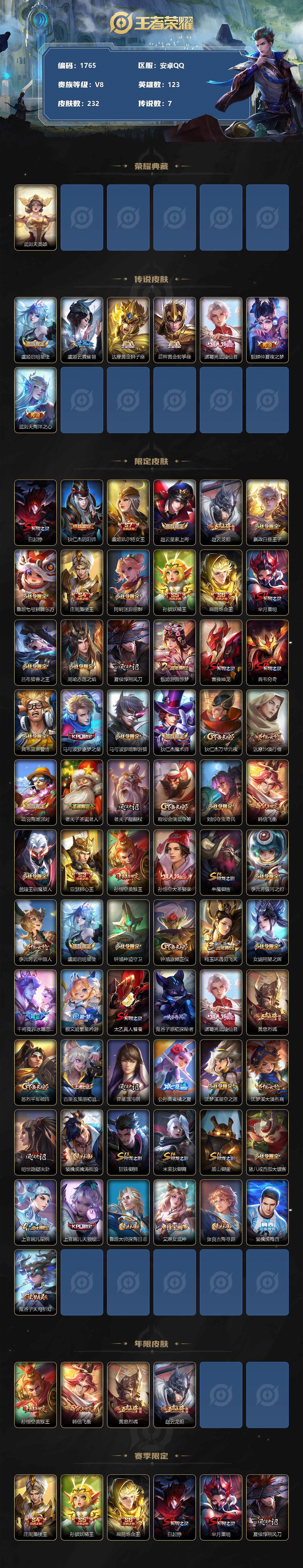 - [12167233]V7 1典藏 10传说 125英雄 284皮肤 可修改实名 优质装备:银白咏叹调(倪克斯侍卫),黄金狮子座,李逍遥,超时空战士-狄仁杰,无双飞将,山海·炽霜斩(李信年限) 珍宝阁皮:妄想食味,优雅恋人,女武神 限定皮:愿照·山河定(司空震年限),逐霄战戟,鸣野蒿,寅虎·展翼(孙膑年限),神威(电光马子),高山流水,怒海麟威,五谷丰年,游园惊梦,梁祝,逐梦之星,李小龙,圣诞老人,真爱至上,猪悟能,匿光追影者,寅虎·御盾(廉颇年限),寅虎·心曲(虎婆),寅虎·赤拳(老虎年限),启示之音 史诗皮:化蝶舞,龙之律动,星界战将,茶境仙,百相守梦-黄忠,蔬乡物语(鲁班七号),黄金分割率,千年之狐,江河有灵,百解令(蒙犽),蒙恬荣光圣徽,偶像歌手,龙骑士(小龙虾),末日机甲-吕布,猫狗日记-大乔,乱世虎臣,节奏热浪,修罗,摇滚巨星,水果甜心,绅士熊喵,天才门将,心灵骇客,功夫厨神,德古拉伯爵,暗隐猎兽者,幽灵船长,鬼剑武藏,心灵战警,地狱岩魂,纤云弄巧,拒霜思,缤纷独角兽,乘风破浪,逐浪之夏,水晶猎龙者,金属风暴,原初追逐者,圣诞狂欢,圣诞恋歌,鹰眼统帅,暗夜贵公子,魅力维加斯,黎明之约,寅虎·御盾,无心,未来纪元-赵云