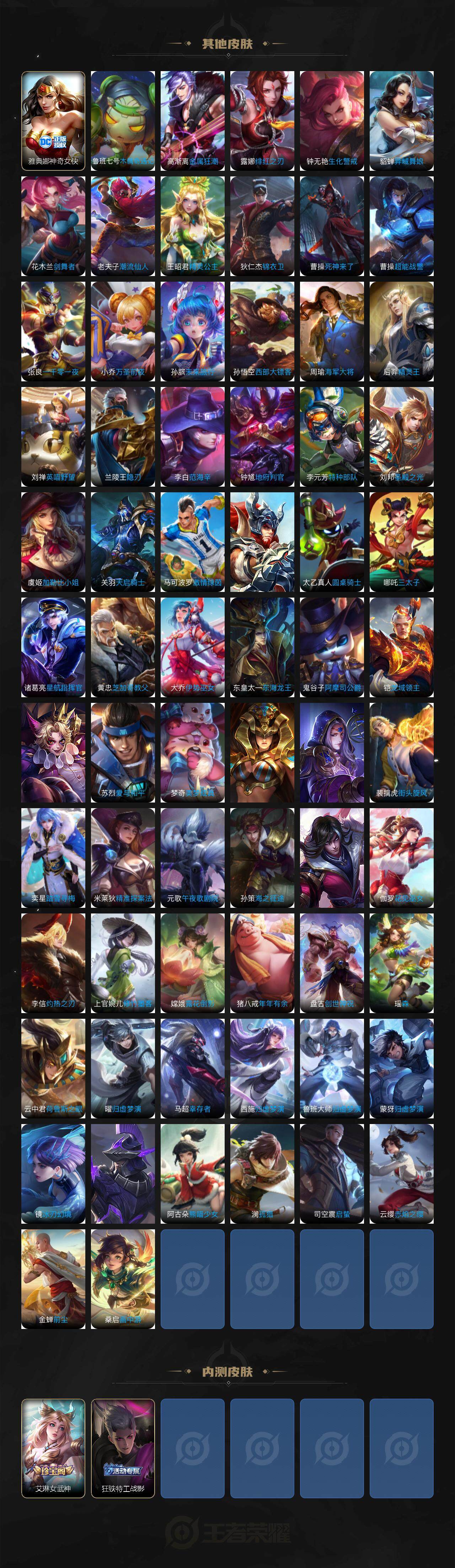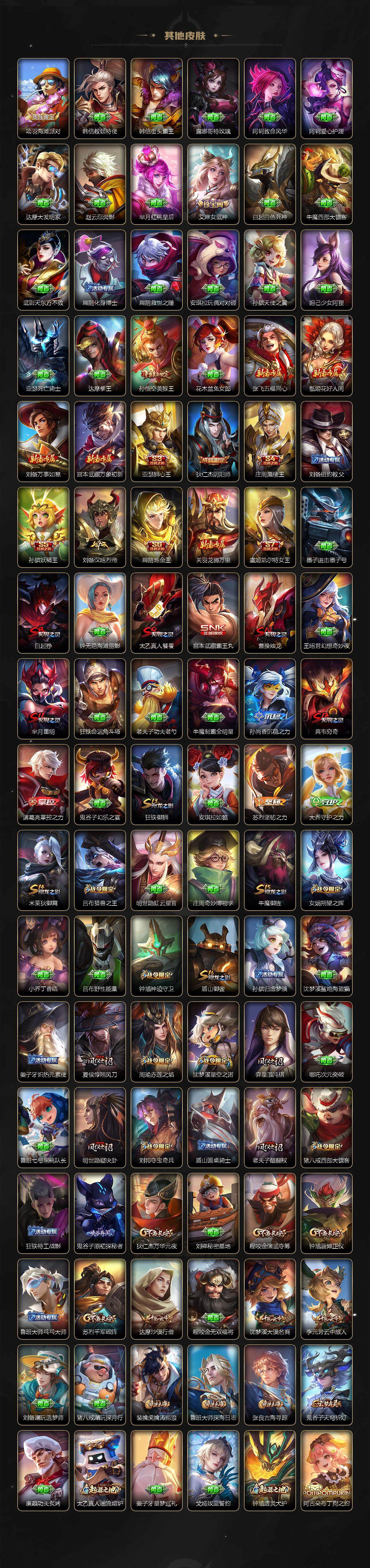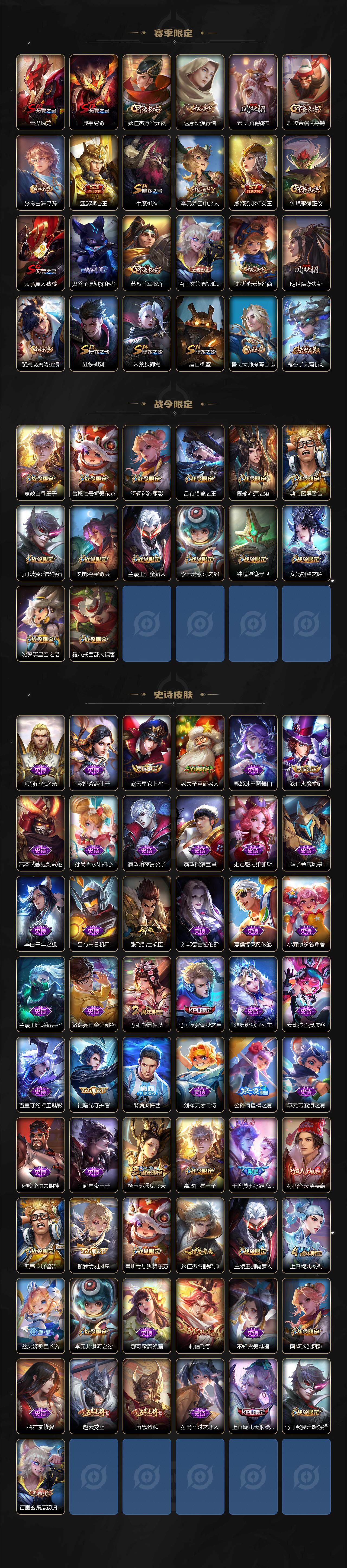 【限定皮肤】:白起狰,狄仁杰阴阳师,虞姬凯尔特女王,赵云皇家上将,赵云龙胆,嬴政白昼王子,鲁班七号狮舞东方,庄周蜃楼王,阿轲迷踪丽影,孙膑妖精王,扁鹊炼金王,芈月重明,吕布猎兽之王,周瑜赤莲之焰,夏侯惇朔风刀,甄姬游园惊梦,曹操烛龙,典韦穷奇,典韦蓝屏警告,马可波罗逐梦之星,马可波罗暗影游猎,狄仁杰魔术师,狄仁杰万华元夜,达摩沙漠行僧,项羽海滩派对,老夫子圣诞老人,老夫子醍醐杖,程咬金演武夺筹,刘邦夺宝奇兵,韩信飞衡,兰陵王驯魔猎人,亚瑟狮心王,孙悟空美猴王,孙悟空大圣娶亲,牛魔御旌,李元芳银河之约,李元芳云中旅人,虞姬启明星使,钟馗神迹守卫,钟馗驱傩正仪,杨玉环遇见飞天,女娲朔望之晖,干将莫邪冰霜恋舞曲,蔡文姬繁星吟游,太乙真人饕餮,鬼谷子原初探秘者,诸葛亮武陵仙君,黄忠烈魂,苏烈千军破阵,百里玄策原初追逐者,弈星混沌棋,公孙离蜜橘之夏,沈梦溪星空之诺,沈梦溪大漠名商,明世隐疑决卦,裴擒虎擒涛扼浪,狂铁御狮,米莱狄御霄,盾山御銮,猪八戒西部大镖客,上官婉儿梁祝,上官婉儿天狼绘梦者,鲁班大师探海日志,艾琳女武神,张良古海寻踪,裴擒虎梅西,鬼谷子天穹祈灯