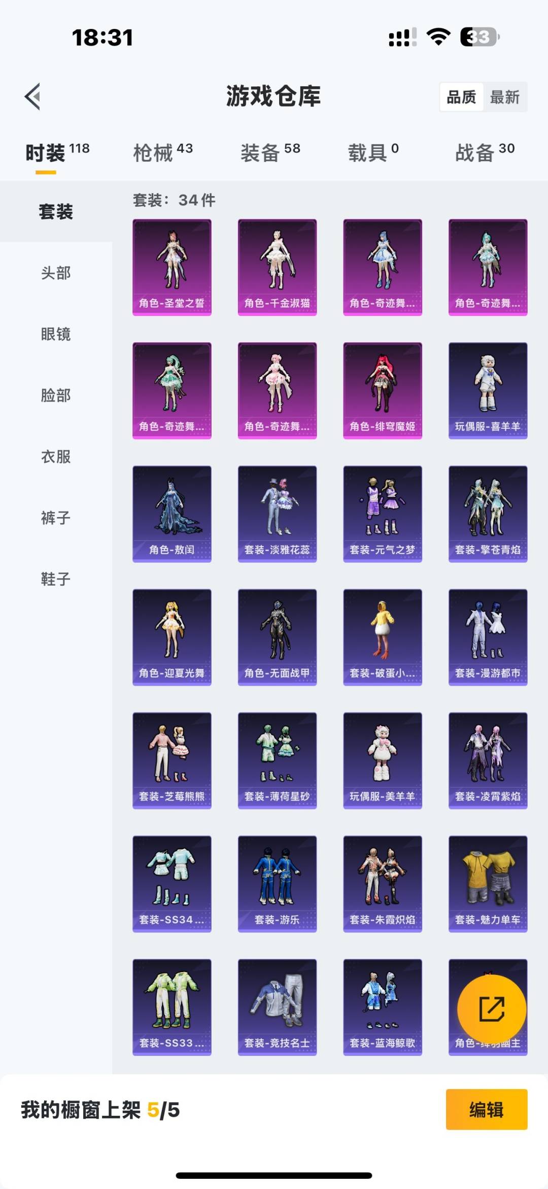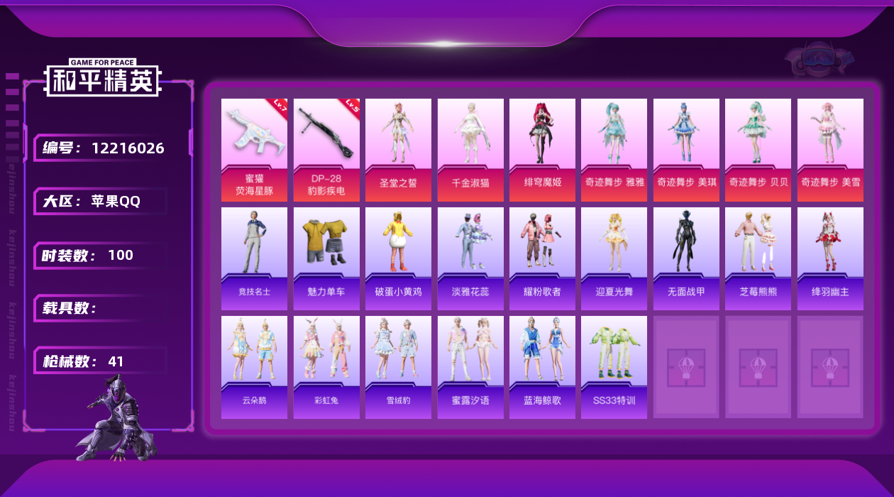 - PX_2090159- 苹果手Q-3王牌印记-1粉装-3特效枪-1载具-32110热力值-80套装-104枪皮-0卓越印记-0传奇印记 【1粉装】,蝶舞迷情 【3特效枪】Kar98K-巳巳如意-3级 AMR-智耀战神-4级 汤姆逊-怪笑疯兔-6级 【1稀有载具】,玛莎拉蒂Ghibli(蓝), 【80稀有时装】,SS31特训,SS33特训,SS32特训,蓝冰羽,紫幽梦,大橘大利,顶瓜瓜,白糯汤圆,