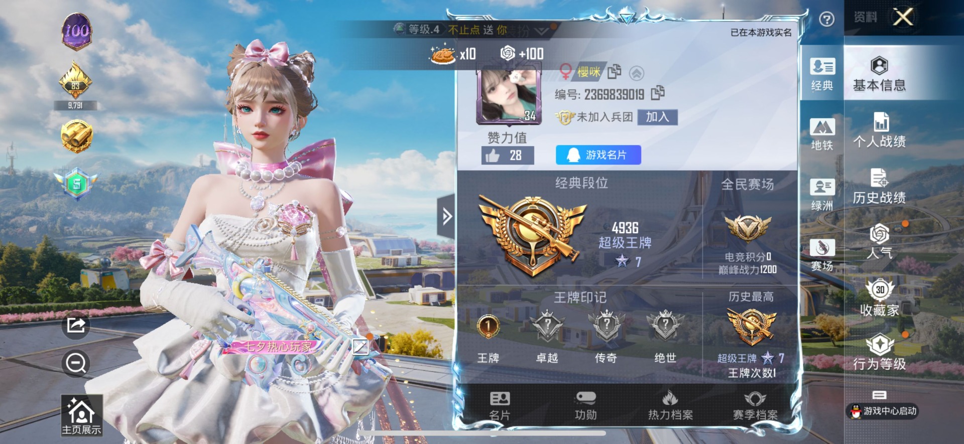 [12216026]7粉装 2特效枪 1印记 可二次 可修改实名 女号 优质装备:千金淑猫,七级蜜獾-荧海星豚,蜜獾-荧海星豚,绯穹魔姬,奇迹舞步-贝贝,奇迹舞步-雅雅,奇迹舞步-美雪,奇迹舞步-美琪 热门装扮:圣堂之誓 稀有枪皮:DP-28-豹影疾电 五级特效枪:五级DP-28-豹影疾电 紫色装扮:云朵鹅,彩虹兔,雪绒豹,SS33特训套装,蓝海鲸歌,无面战甲,绛羽幽主,蜜露汐语,魅力单车,破蛋小黄鸡,迎夏光舞,竞技名士,芝莓熊熊,淡雅花蕊,耀粉歌者 优质战备:奇迹舞步降落伞,绯穹魔姬降落伞,荧海星豚降落伞