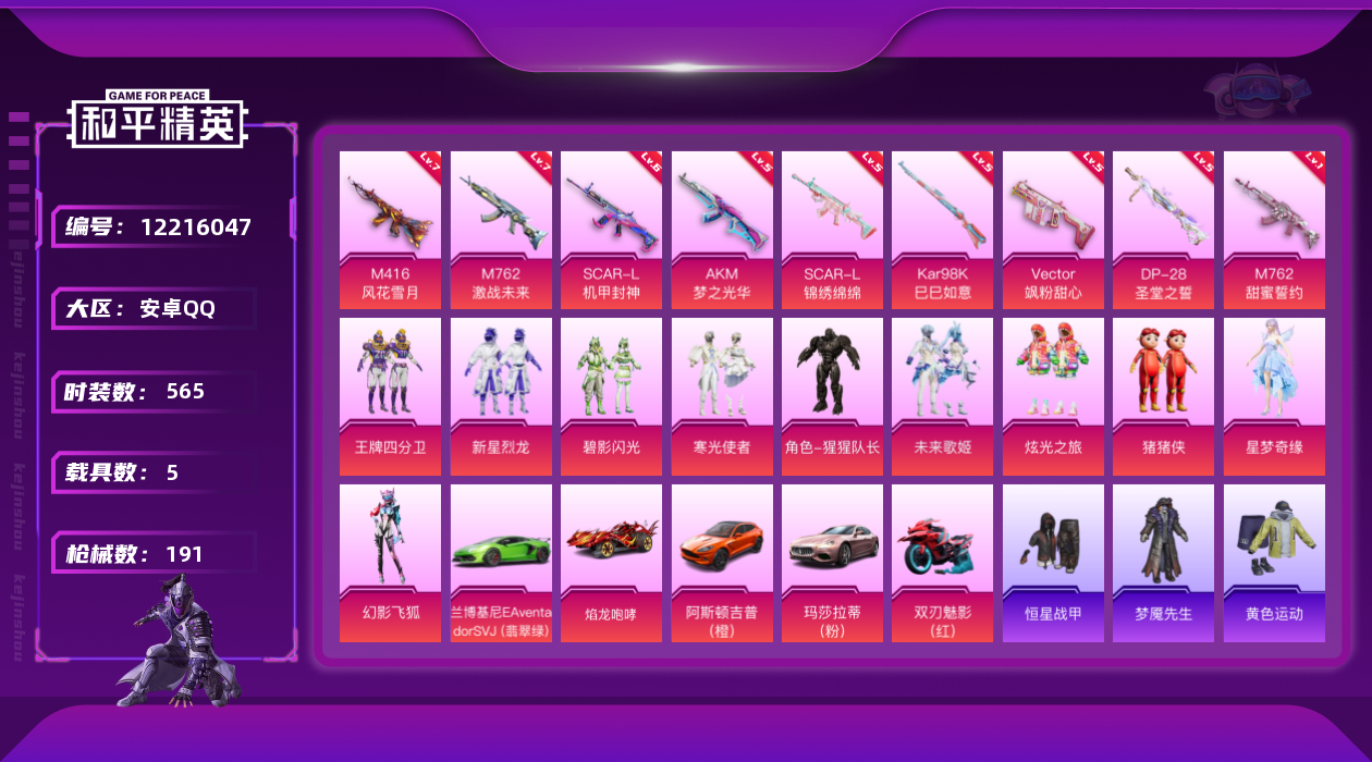 - PX_2088346- 可二次 安卓手Q-12王牌印记-0粉装-5特效枪-0载具-44497热力值-135套装-148枪皮-0卓越印记-0传奇印记, 【5特效枪】,SCAR-L-锦绣绵绵-5级,M416-电玩时刻-5级,AUG-暖羊咩咩-5级,Kar98K-巳巳如意-5级,UMP45-量子极限-5级, 【3稀有紫装】,雪山精英,龟仙人,暗夜魅影, 【135稀有时装】,恋语绒绒,暗夜魅影,龟仙人,雪