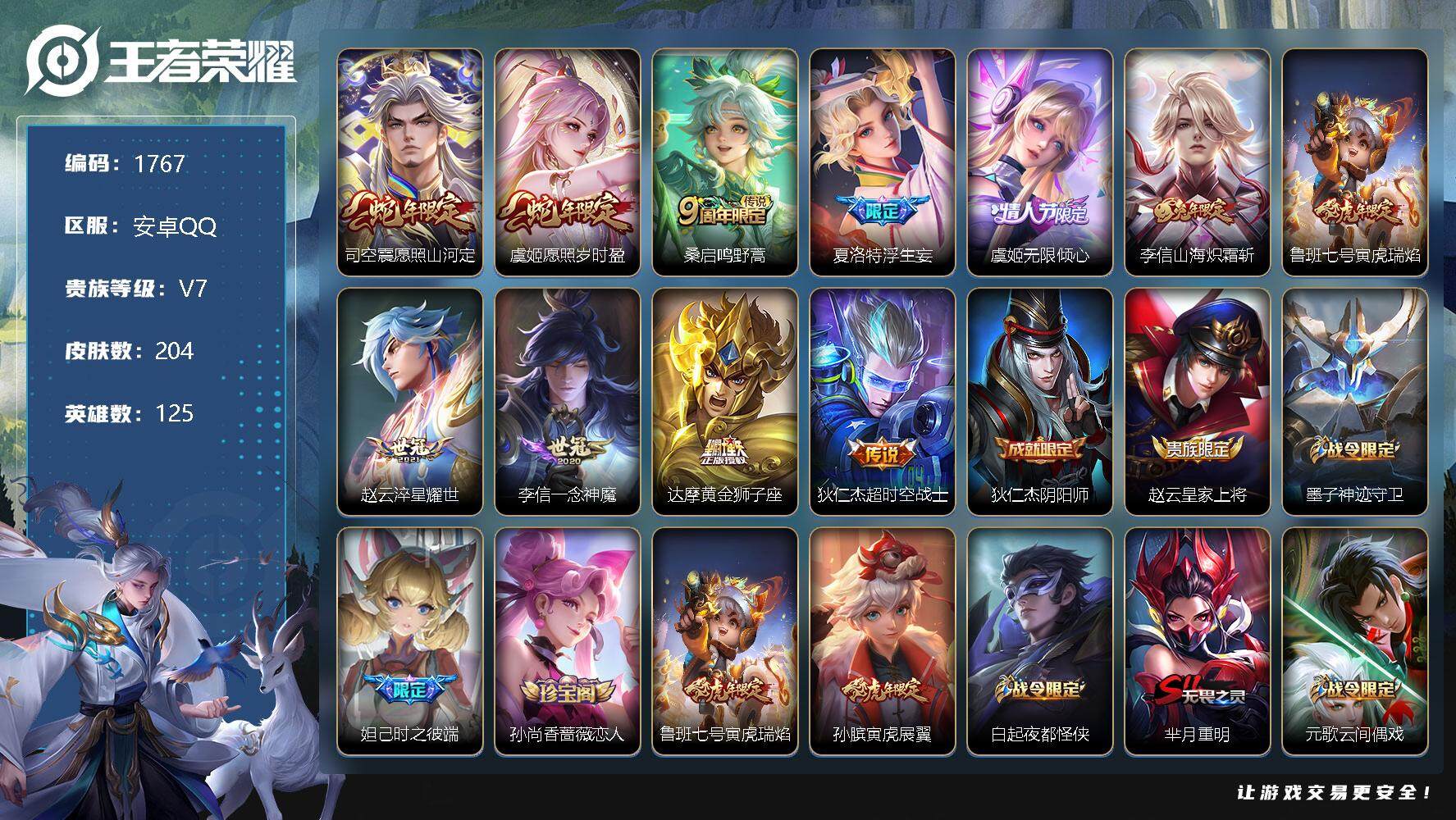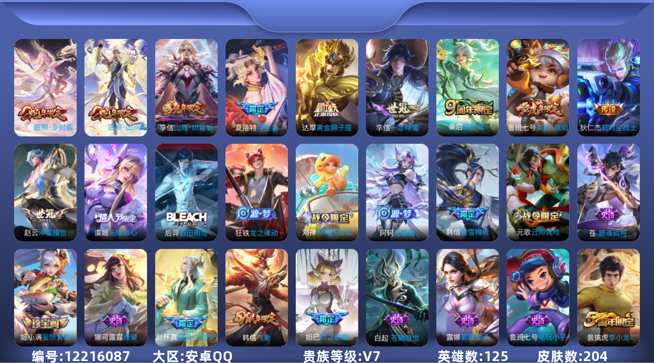 [12216087]【商品标题】:安卓Q-V5-尊贵铂金III段位-125英雄-204皮肤-0典藏-0珍品无双-0无双-0珍品传说-11传说-50史诗