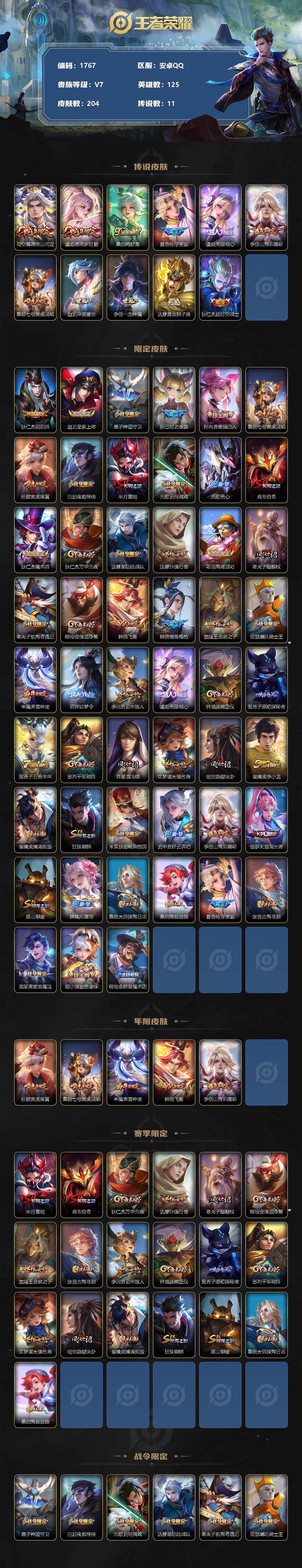 - [11209258]V7 5传说 125英雄 203皮肤 可修改实名 优质装备:云鹰飞将(小将军),一念神魔,无双飞将 珍宝阁皮:蔷薇恋人,女武神 限定皮:至尊宝,神威(电光马子),高山流水,五谷丰年,青龙志(铠年限),武圣,梁祝,李小龙,猪悟能,天魔缭乱 史诗皮:龙之律动,紫霞仙子,白龙吟,黄金分割率,特工魅影,千年之狐,魅语,蒙恬荣光圣徽,猫狗日记-孙策,乱世虎臣,节奏热浪,女仆咖啡,摇滚巨星,水果甜心,德古拉伯爵,幽灵船长,鬼剑武藏,舞动绿茵,繁星吟游(呼啦呼啦),乘风破浪,水晶猎龙者,金属风暴,原初追逐者,圣诞狂欢,圣诞恋歌,鹰眼统帅,王者之锤,魅力维加斯,黎明之约,赏金猎手