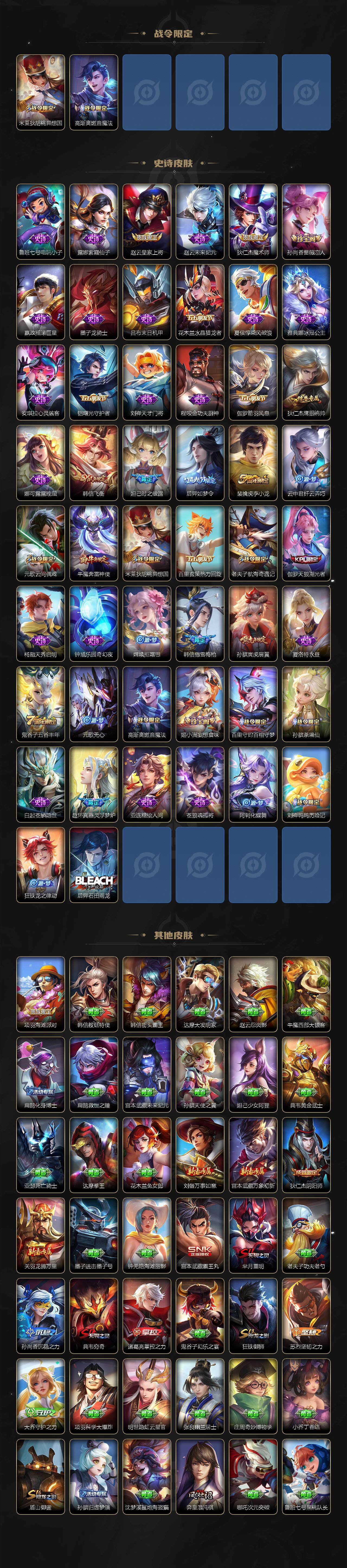 【史诗皮肤】:鲁班七号电玩小子,露娜紫霞仙子,赵云皇家上将,赵云未来纪元,狄仁杰魔术师,孙尚香蔷薇恋人,嬴政摇滚巨星,墨子龙骑士,吕布末日机甲,花木兰水晶猎龙者,夏侯惇乘风破浪,雅典娜冰冠公主,安琪拉心灵骇客,铠曙光守护者,刘禅天才门将,程咬金功夫厨神,伽罗箭羽风息,狄仁杰鹰眼统帅,娜可露露晚萤,韩信飞衡,妲己时之彼端,后羿如梦令,裴擒虎李小龙,云中君纤云弄巧,元歌云间偶戏,牛魔奔雷神使,米莱狄胡桃异想国