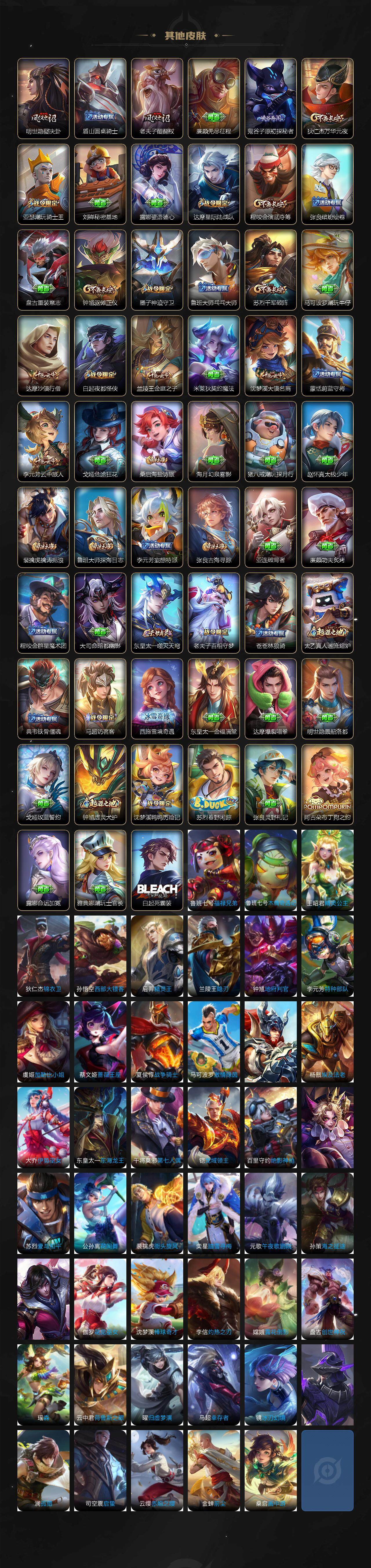 【赛季限定】:芈月重明,典韦穷奇,狄仁杰万华元夜,达摩沙漠行僧,老夫子醍醐杖,程咬金演武夺筹,兰陵王金庭之子,张良古海寻踪,李元芳云中旅人,钟馗驱傩正仪,鬼谷子原初探秘者,苏烈千军破阵,弈星混沌棋,沈梦溪大漠名商,明世隐疑决卦,裴擒虎擒涛扼浪,狂铁御狮,盾山御銮,鲁班大师探海日志,桑启海盐诗旅