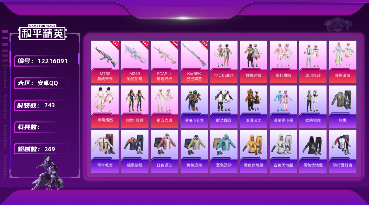 [12216091]8粉装 4特效枪 11印记 可二次 可修改实名 连体王者 优质装备:蝶舞迷情,宝贝奶油派,M762激战未来,M249彩虹甜喵(M249-彩虹甜喵),SCAR-L-锦绣绵绵,七级M249-彩虹甜喵,七级M762-激战未来,桃粉嫣然,Kar98K-巳巳如意 热门装扮:彩虹甜喵,冰川红玫,第五大道,莲影清波,创世·救赎,软萌银虎,胖达圆圆,激萌罗小黑,深海小丑鱼,浪漫波比 五级特效枪:五级Kar98K-巳巳如意,五级SCAR-L-锦绣绵绵 紫色装扮:琉璃情波,田园牧歌,轻风白浪,和煦暖阳,SS22特训,SS23特训,幻彩翩翩,灵蜜圈圈,妙红点点,香榭午后,娇憨猪猪,梦幻奶油,俏皮奶喵,暖心橘喵,萌趣咩咩,暖心熊熊,SS21特训,SS31特训套装,人气偶像,冷焰舞者,北国孤狼,千禧之恋,SS33特训套装,青涩时光,顶瓜瓜,SS20特训,青春冒险家,潮流游乐家,SS15特训,SS16特训,爆裂葡萄,银白舞王,SS13特训,浪漫樱花,治愈之星,迅捷之星,科技之星,SS14特训,萌趣颜团子,特种颜团子,飞驰魅影,音速流光,SS19特训,吉莉礼服,甜心亚梦,虚音幻奏,浓情蜜辣,瑞龙福将,团圆交子,SS17特训,沁蓝冰爽,异彩先驱,缤纷焰火,SS18特训,都市魅力,酒红色名流,野性战心,长空猛禽,霓虹极客,霓虹街区,青年教官,缤纷果语,荣耀,蓝彩潮人,蓝色运动,虎虎生威吉莉,血色贵族,街头潮人,跃动心情,蓝海鲸歌,飞行日记,骑行爱好者,魅力单车,鹤鸣,麻辣教官,黄色伏地魔,黄色名流,黄色运动,黎明保卫者,黑色伏地魔,龙的传人,龟仙人,冰河战士,龙魂突击队,蝶变,香桃花海,缤纷假日,极速红龙,柠萌假日,格斗先锋,橘黑制服,沙漠兵团,沙漠探路者,活力之心,海岛探路者,涂山之恋,深蓝色名流,滨海假日,夏日音浪,完美偶像,帅气教官,幻世战舞者,战地督导,探宝勇士,湖蓝色名流,滨海厨神,绮丽涂鸦,登山爱好者,白熊同盟,白色伏地魔,破晓战魂,破蛋小黄鸡,神秘领域,福星高照,空岛之星,空投萌叽,竞技勇士朋克,竞技达人朋克,红色运动,甜蜜熊情侣,王牌教练,牛气冲天,灼焰舞者,炫蓝之夏,热血青春,牛气满满,猛禽,特战装甲,特殊使命,特训学院,猎鹰,镭射皇者,静谧青瓷,小熊娃娃,雏菊兔兔,萝兰蝴蝶,SS29特训,狂花道·雅典娜,星途旅人,白光莹,纯真浪花,热情海星,SS28特训,红潮炫舞,玉兔迎春