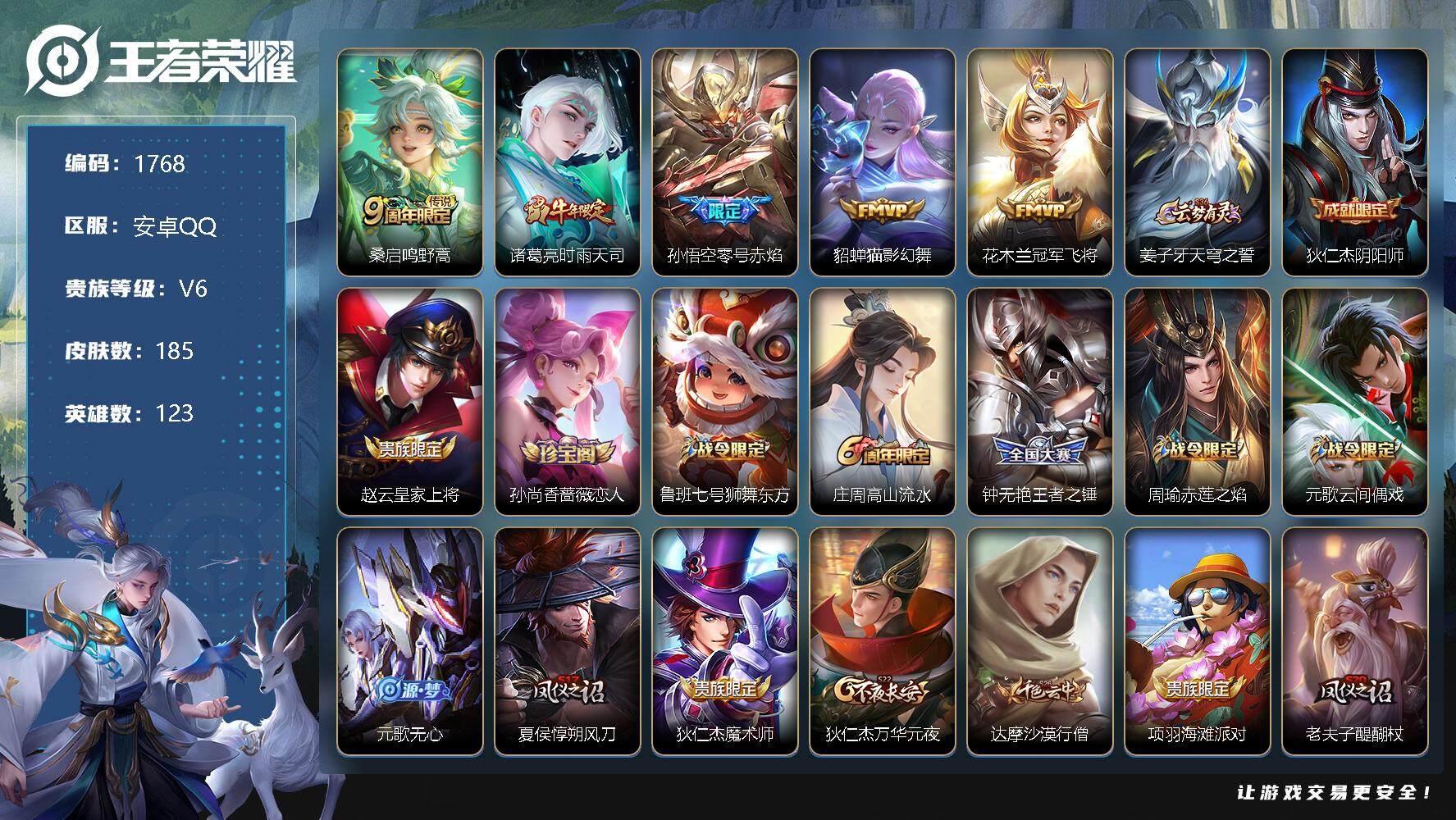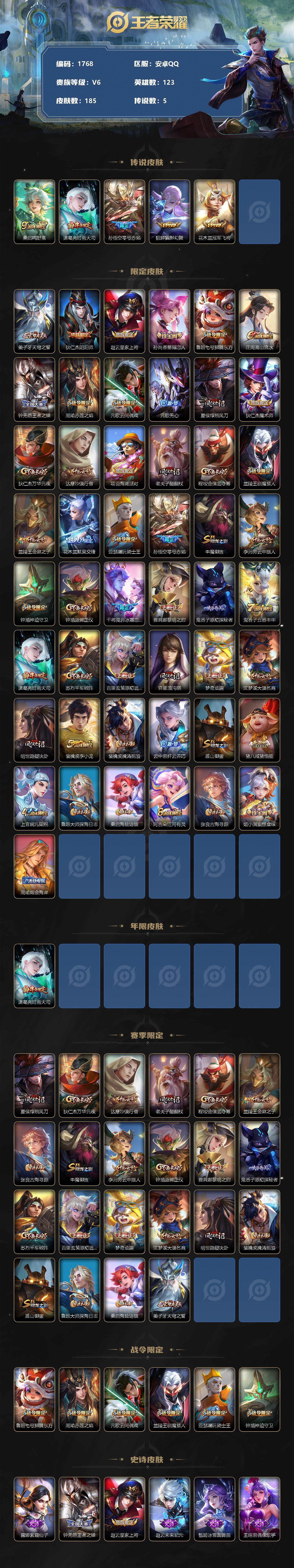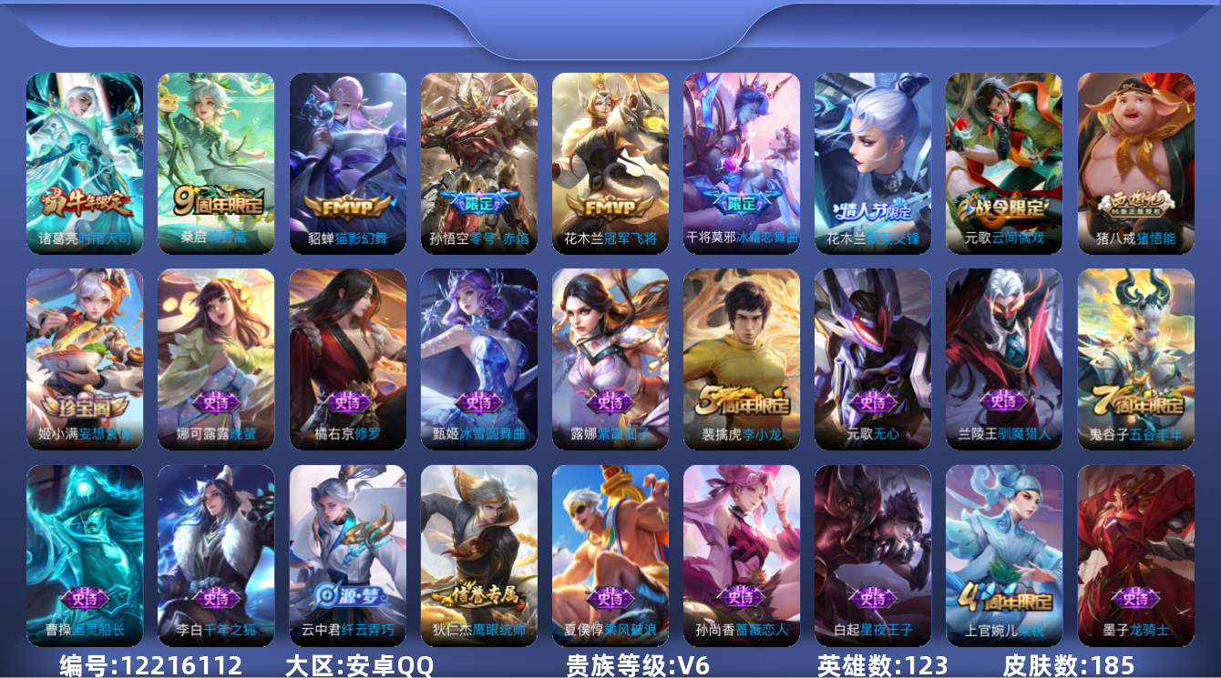 [12216112]【商品标题】:安卓Q-V0-尊贵铂金III段位-123英雄-185皮肤-0典藏-0珍品无双-0无双-0珍品传说-5传说-51史诗